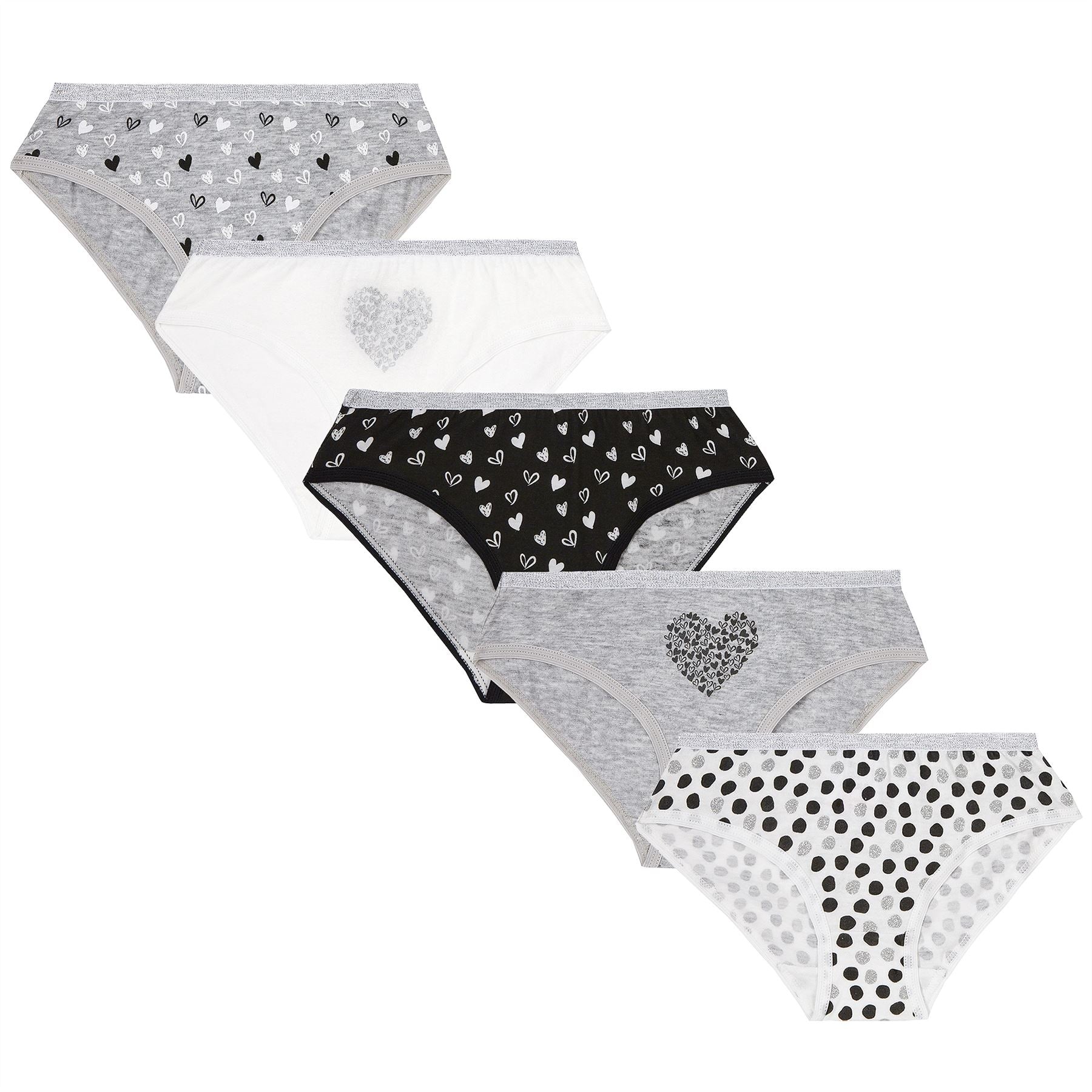 Girls' 100% cotton briefs 5 pack, with monochrome/hearts designs.