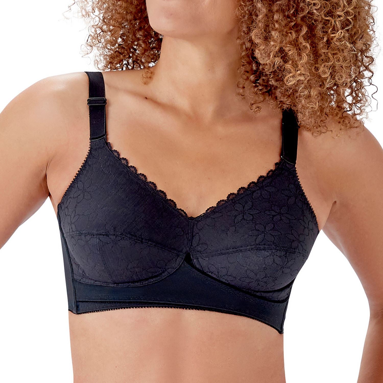 Berlei classic total support bra in black. It features seamed, non-wired cups and a cross over centre. The bra is unpadded and has flat floral lace, bones in the side seams and fully adjustable straps.