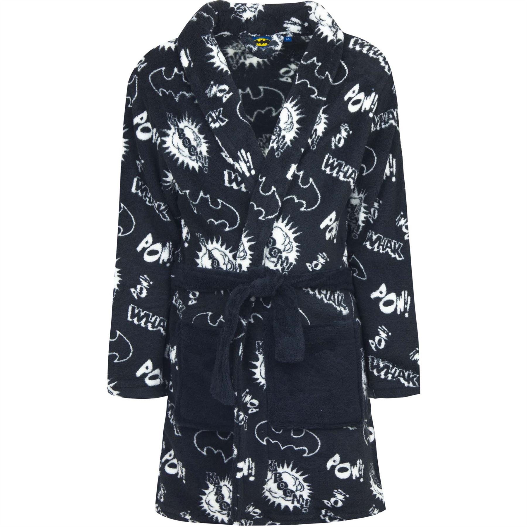 Kids' fleece robe with a printed Batman POW! design and matching tie belt, in black.