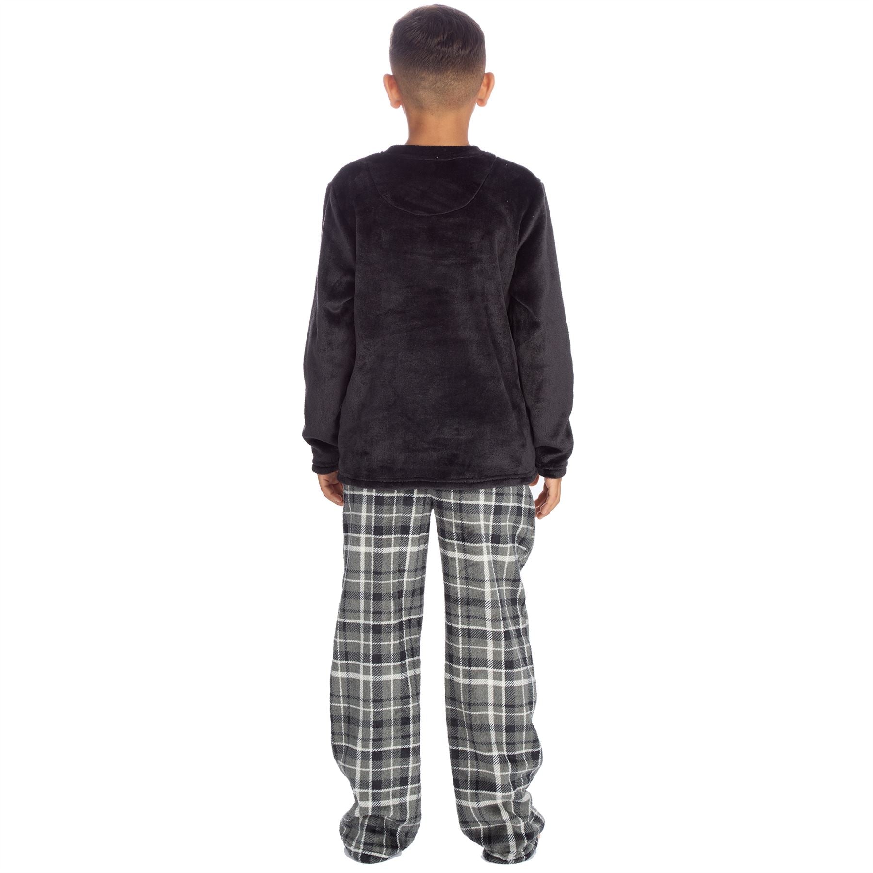 Kids' fleece pyjama set with a plain black, long sleeve top and grey check print bottoms with an elasticated waist and side pockets.