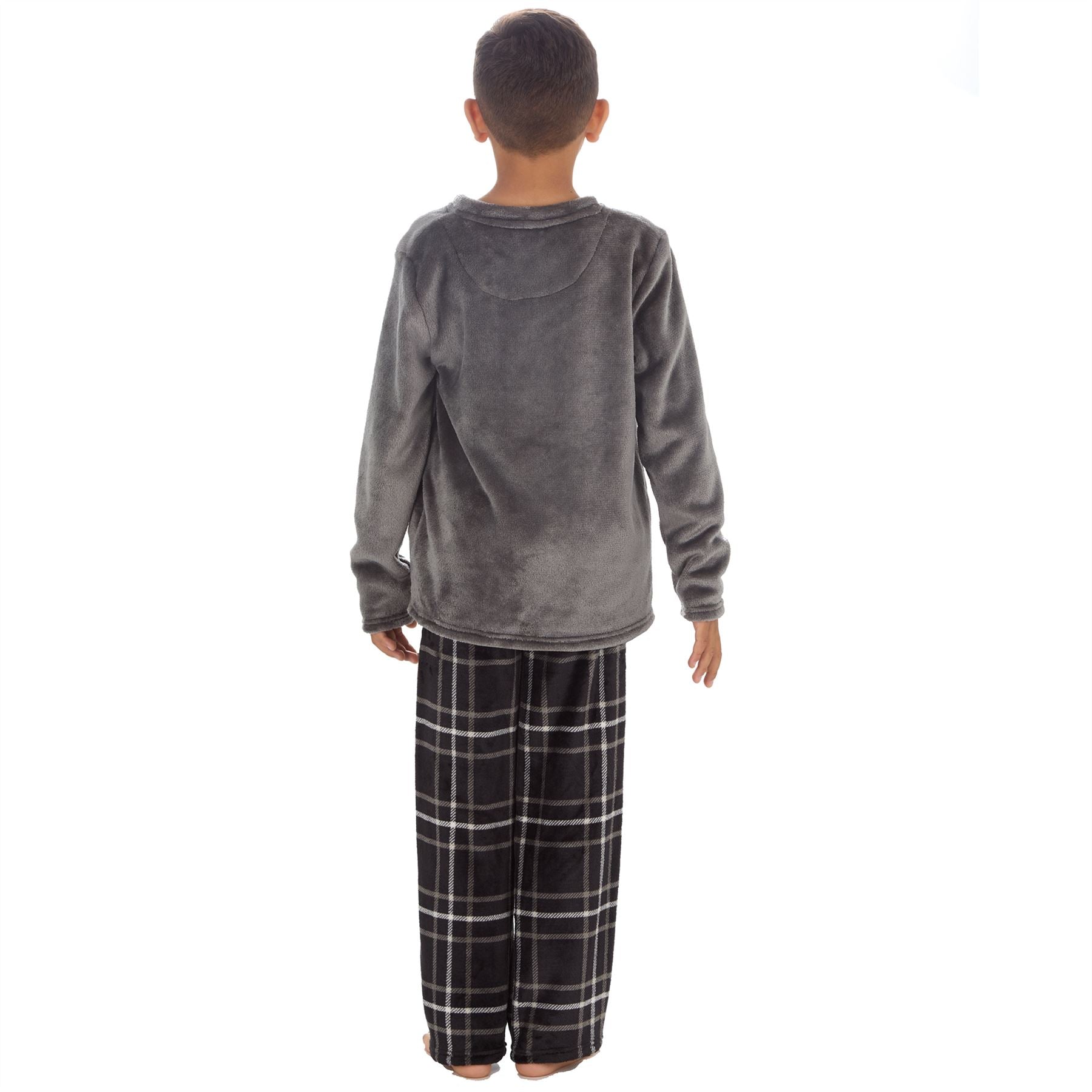 Kids' fleece pyjama set with a plain grey, long sleeve top and black check print bottoms with an elasticated waist and side pockets.