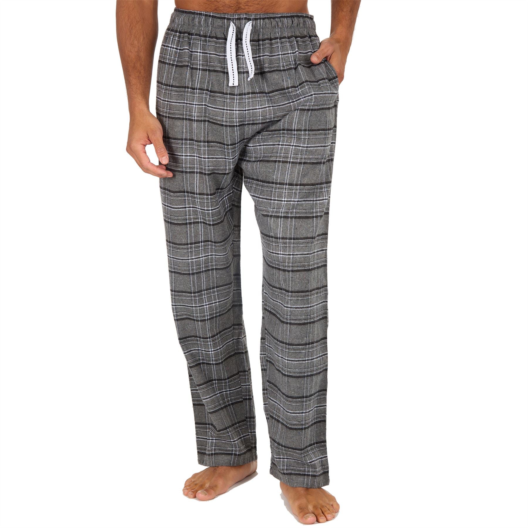 Men's flannel lounge pants with a printed check design, in grey. They have an elasticated waistband and a drawstring tie fastening at the front. The bottoms have a pocket each side.