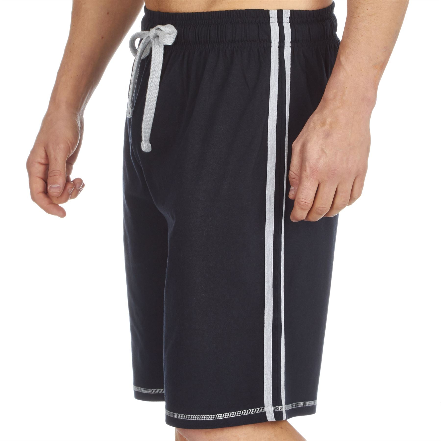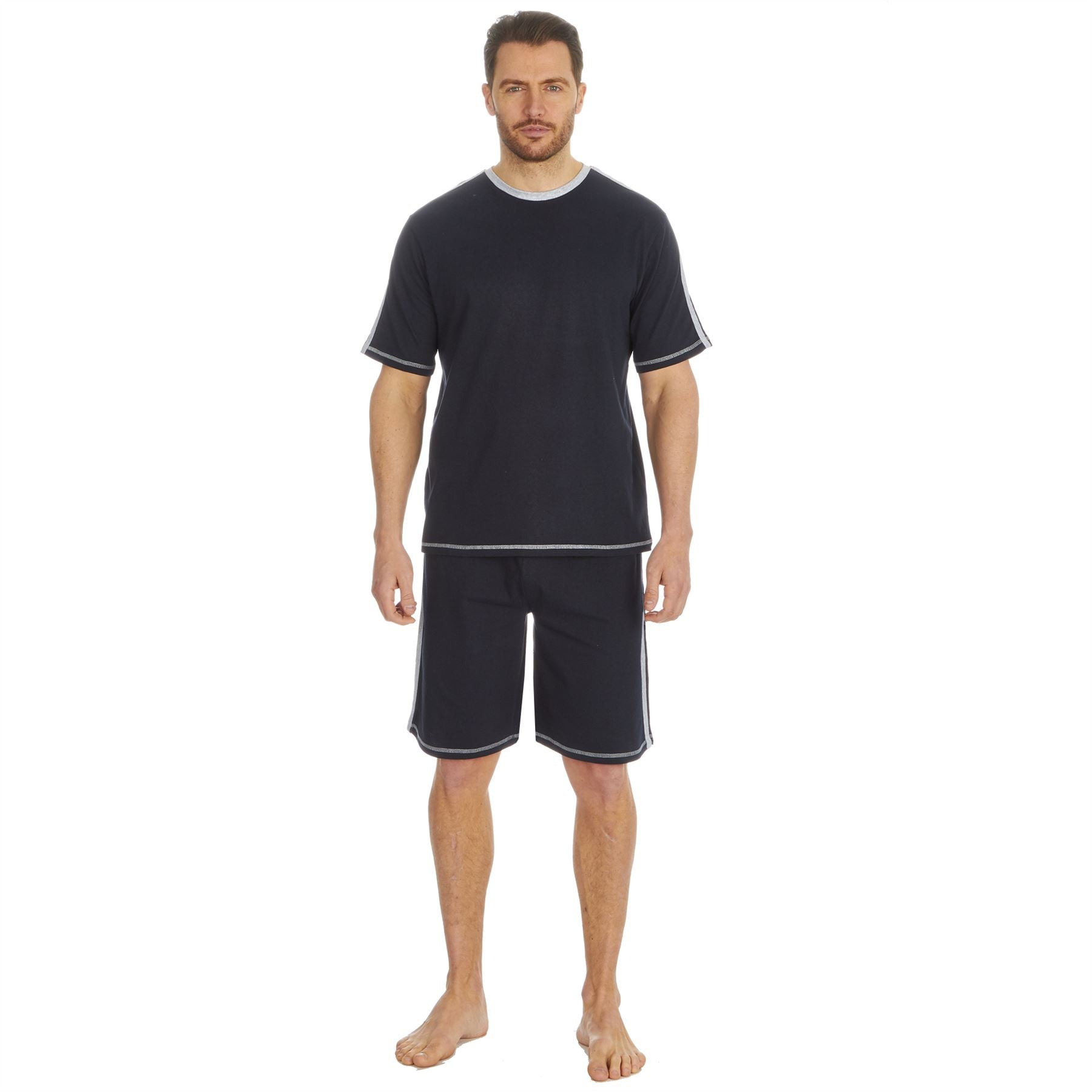 Men's short sleeve round neck top and matching shorts in navy/grey, with contrast stripe detail.