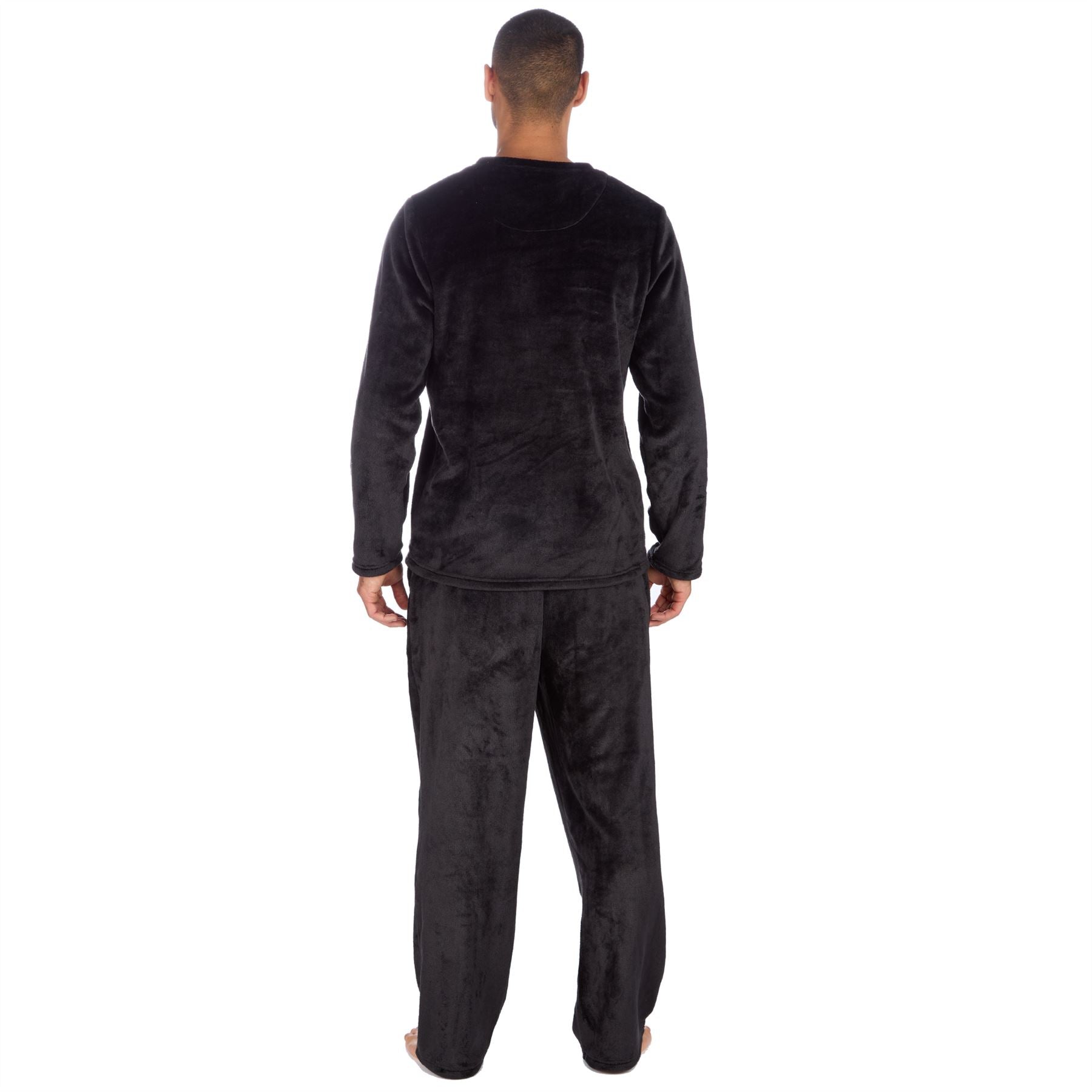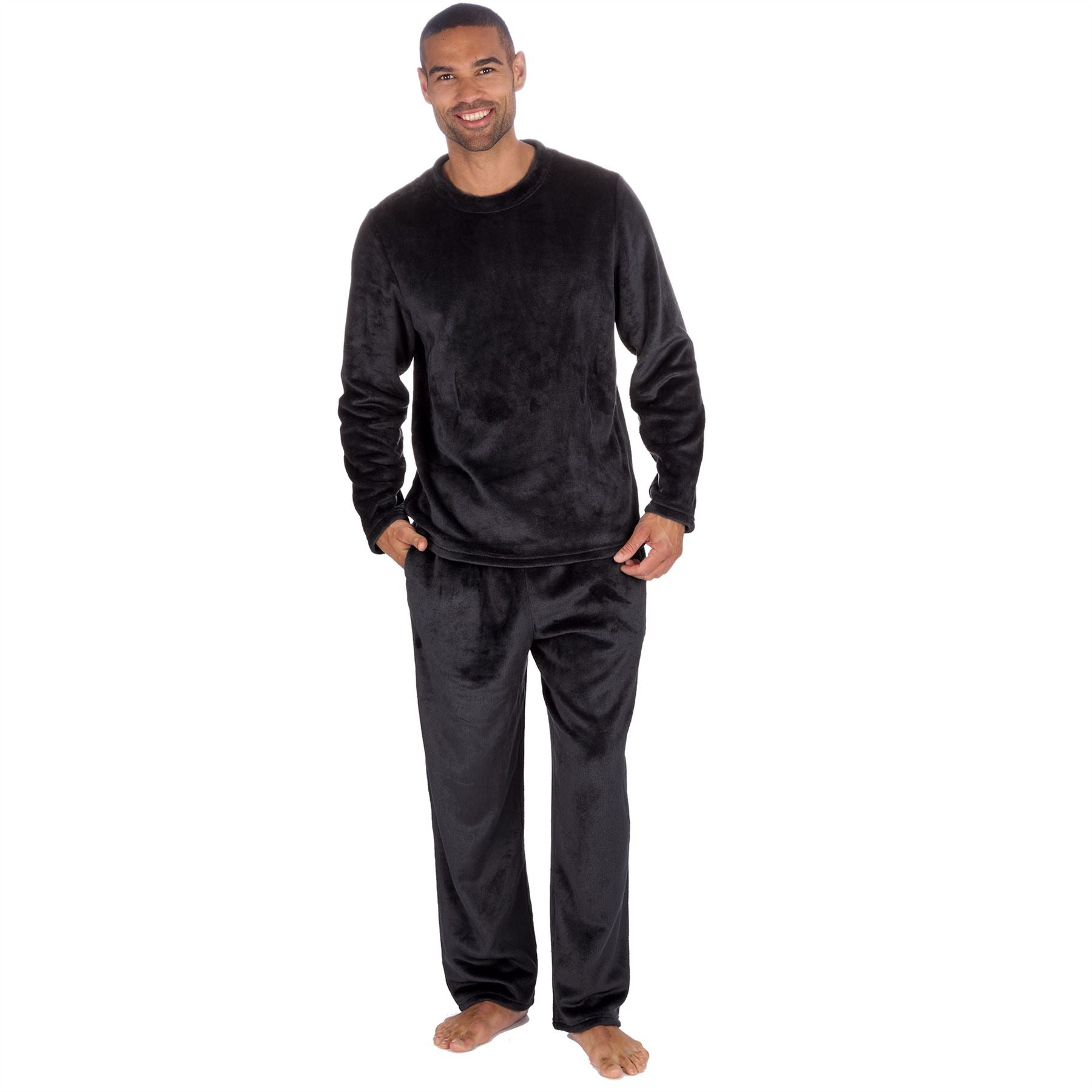 Men's black long sleeve flannel fleece pyjama set, with side pockets and a drawstring elasticated waist.
