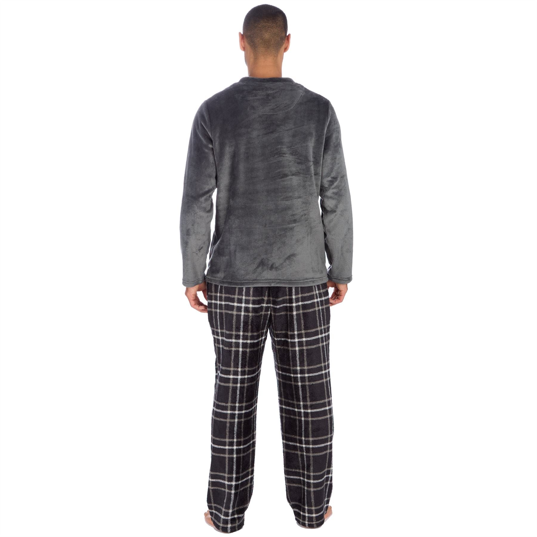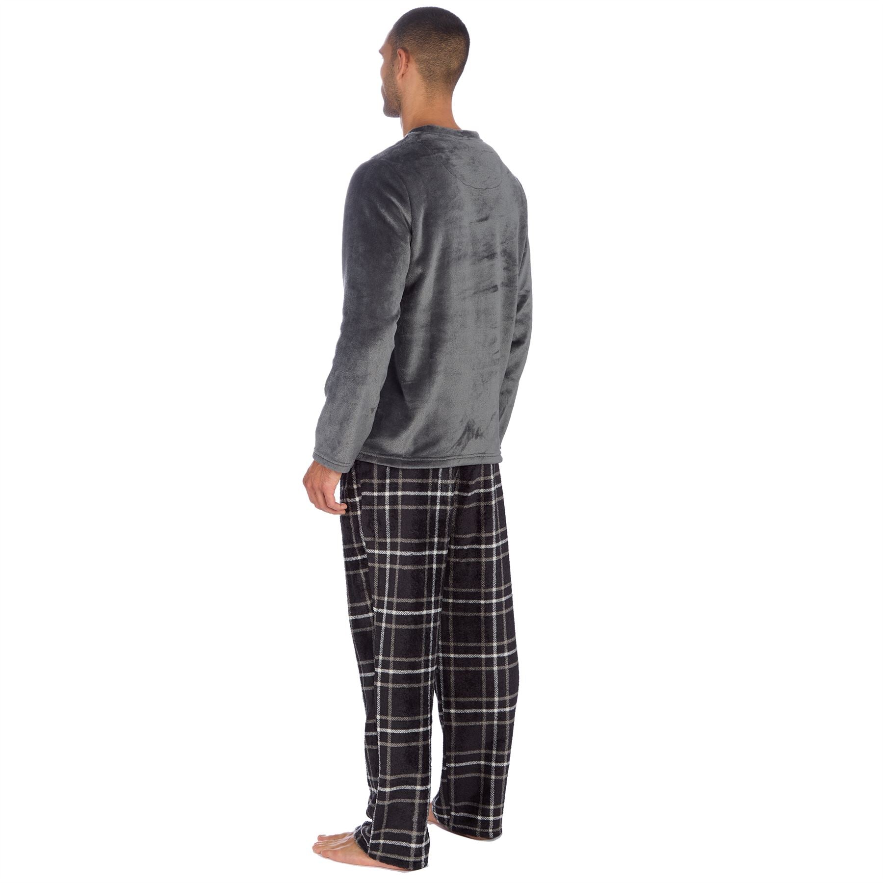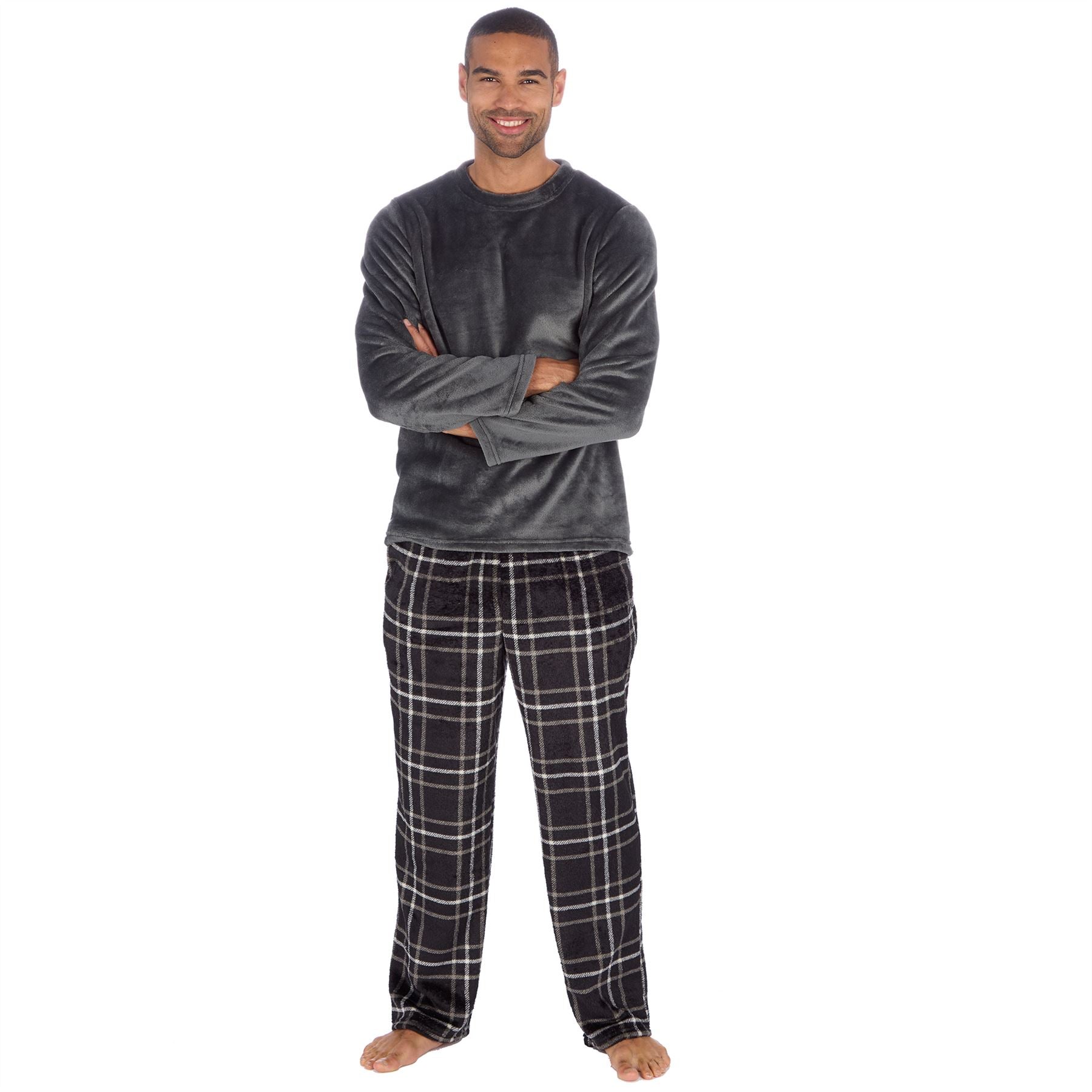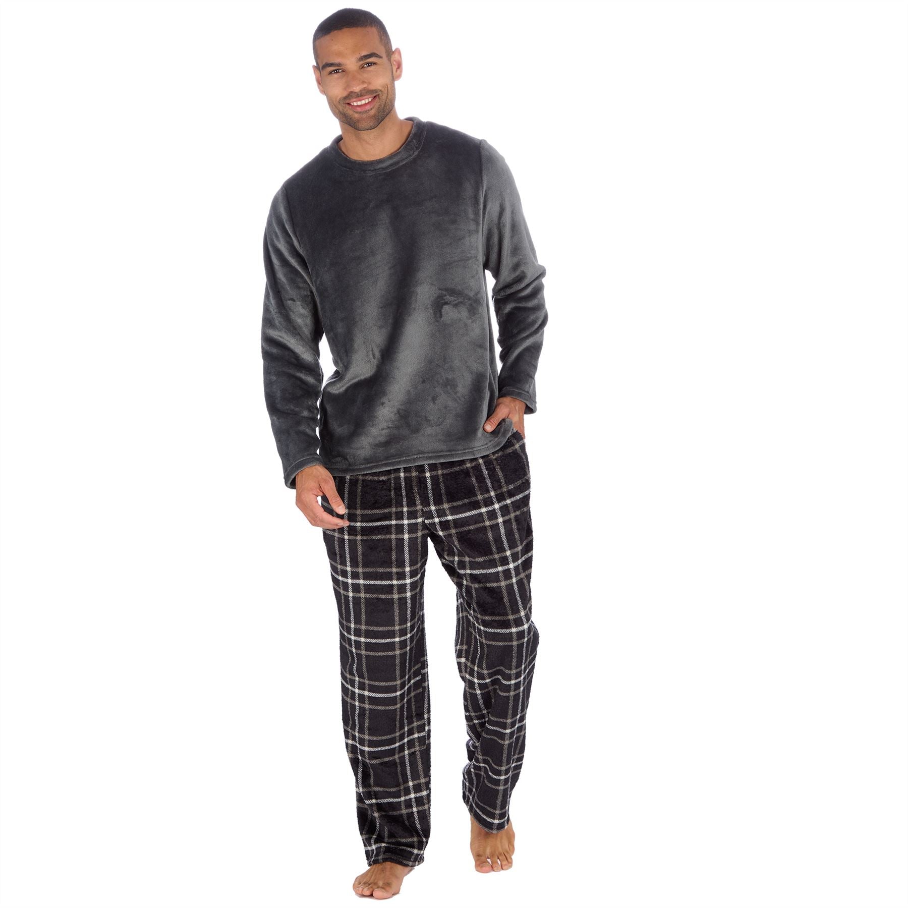 Men's long sleeve fleece pyjama set, featuring a plain grey top and black check bottoms, with side pockets and a drawstring elasticated waist.