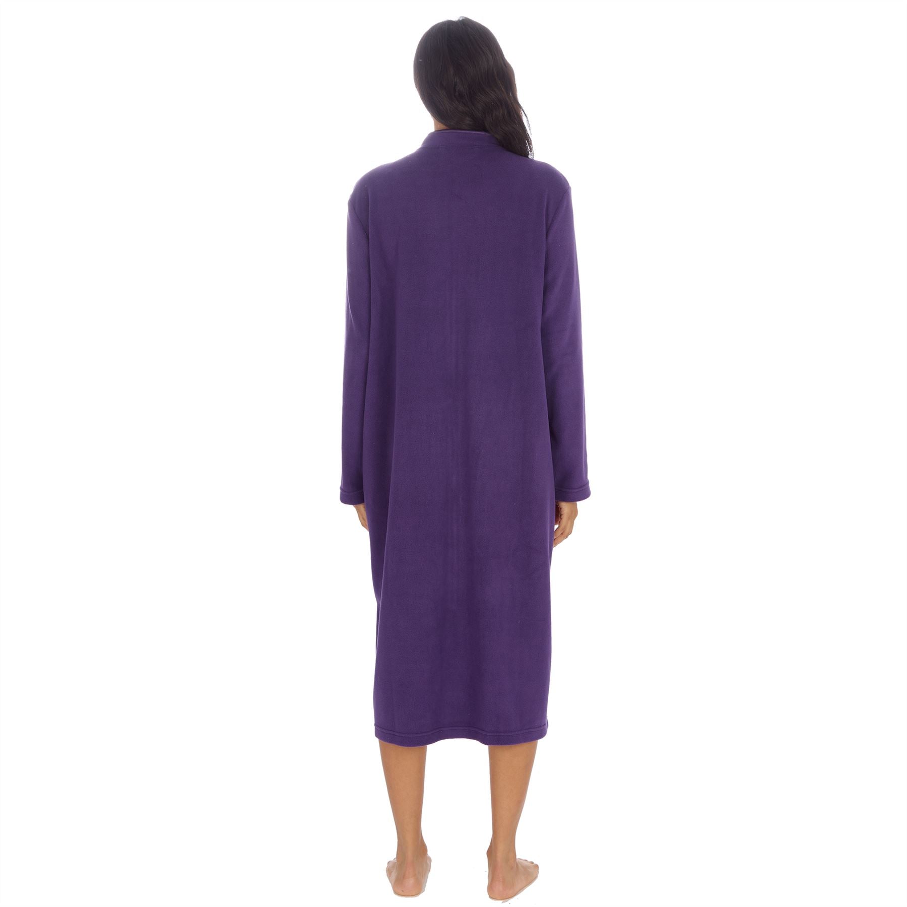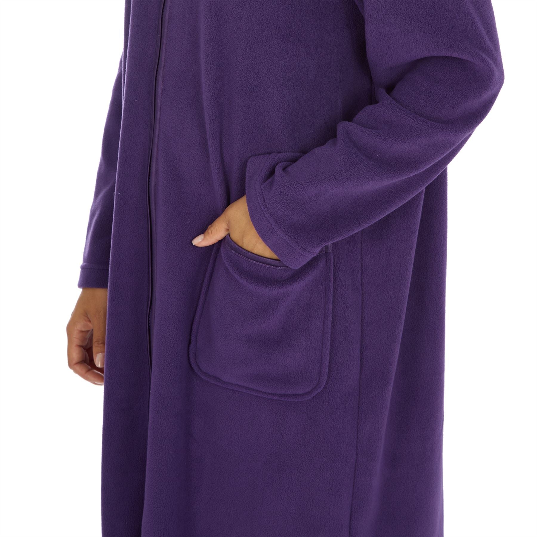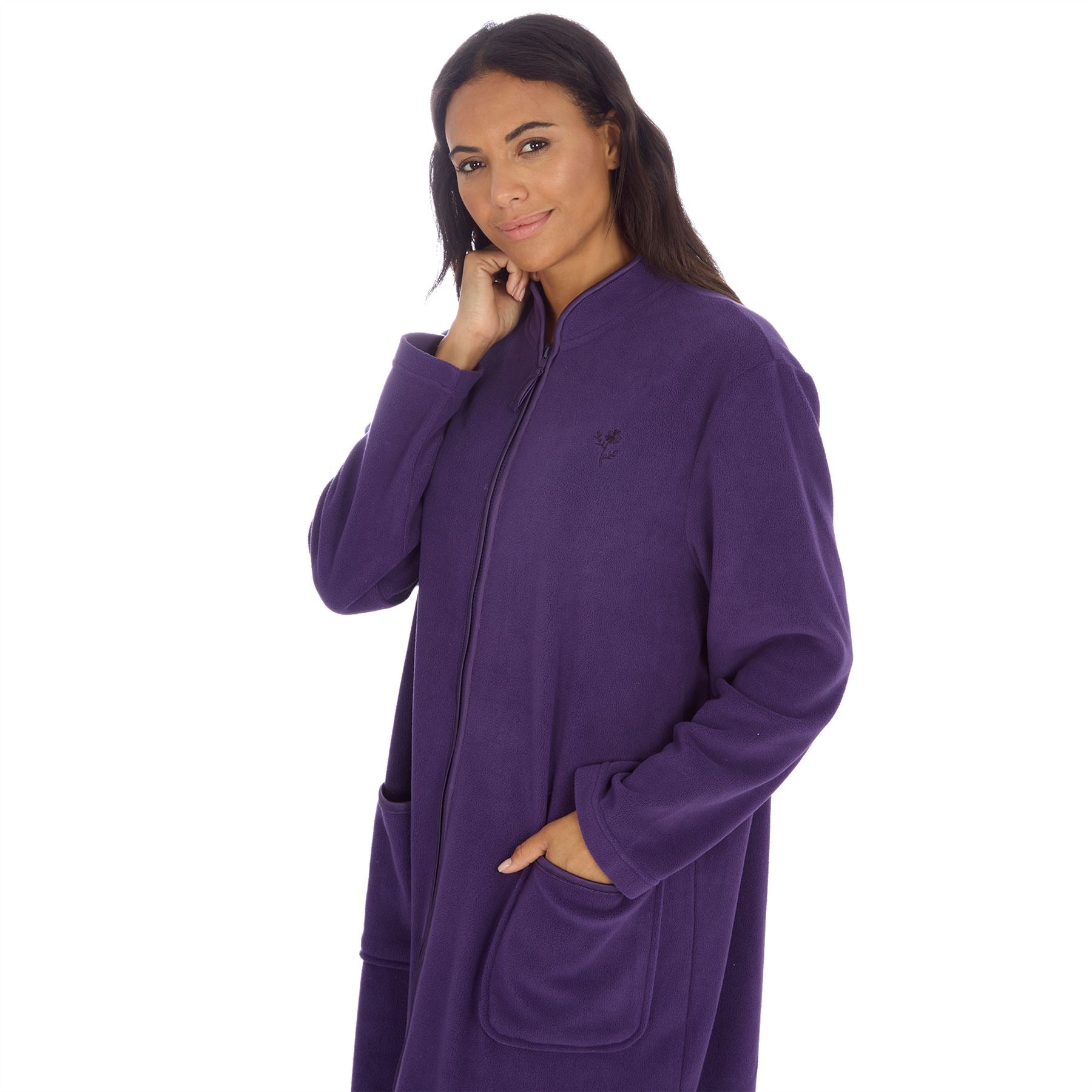 Women's soft handle, longer length, fleece zip through robe in purple, with patch pockets and embroidered detail.