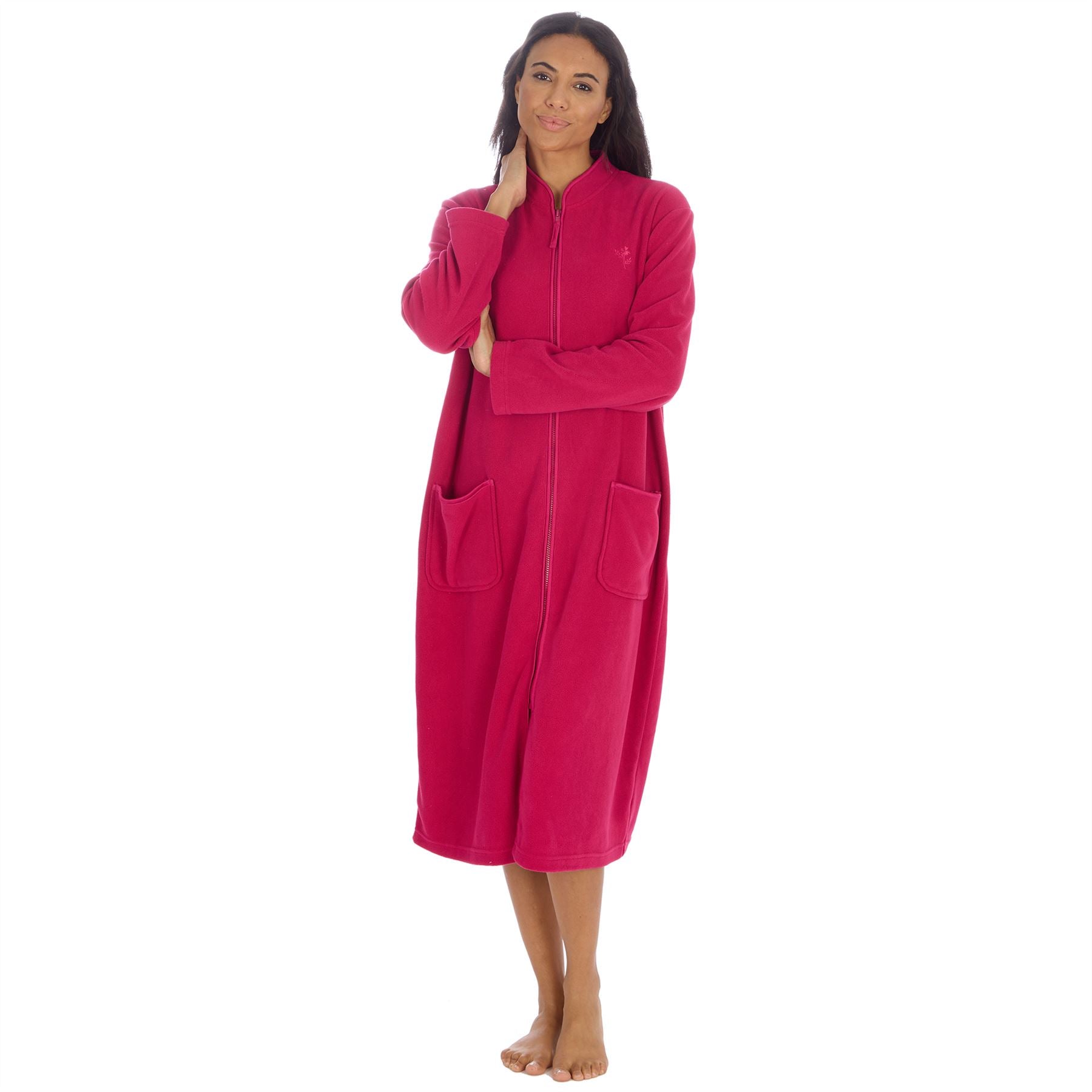 Women's soft handle, longer length, fleece zip through robe in raspberry, with patch pockets and embroidered detail.