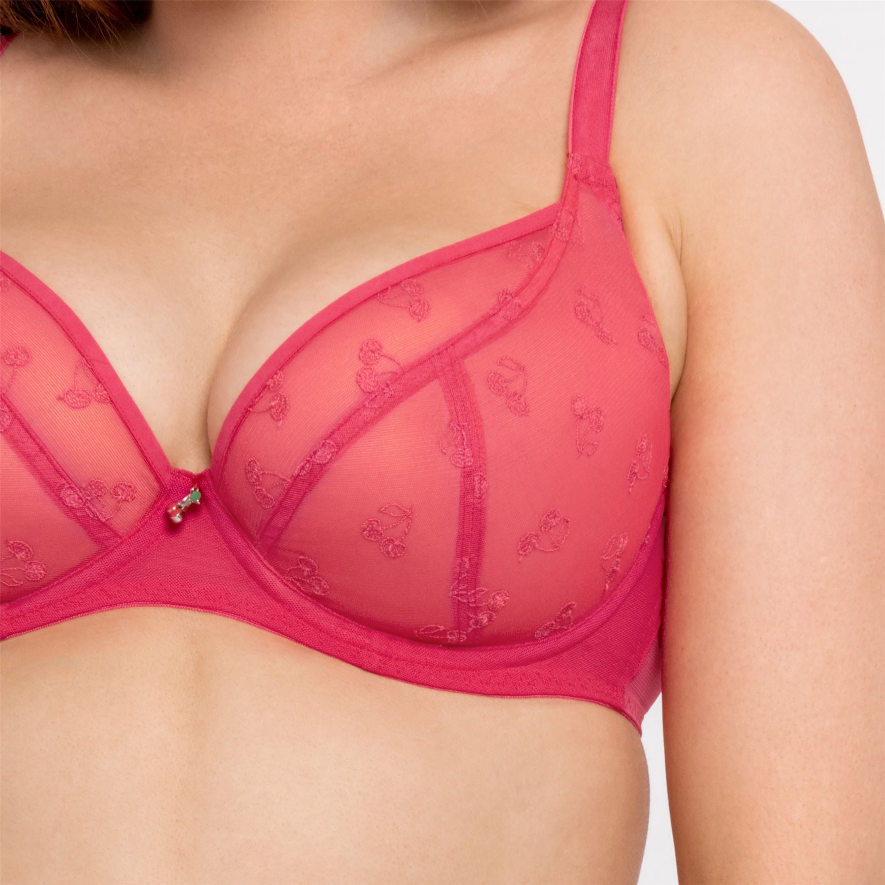 Curvy Kate Cherry Pop plunge bra in cherry glow. It features sheer, three section cups, with cherry embroidery, and fully adjustable straps. The bra is underwired and unpadded, with a cherry charm.