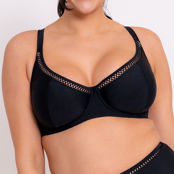 Curvy Kate Swimwear First Class balcony bikini top in black. It features lined, unpadded cups with a criss-cross design across the top. The bikini top is underwired, with a snap clasp fastening and straps which are fully adjustable and detachable at the back. It can be worn halterneck, with normal or crossover straps.