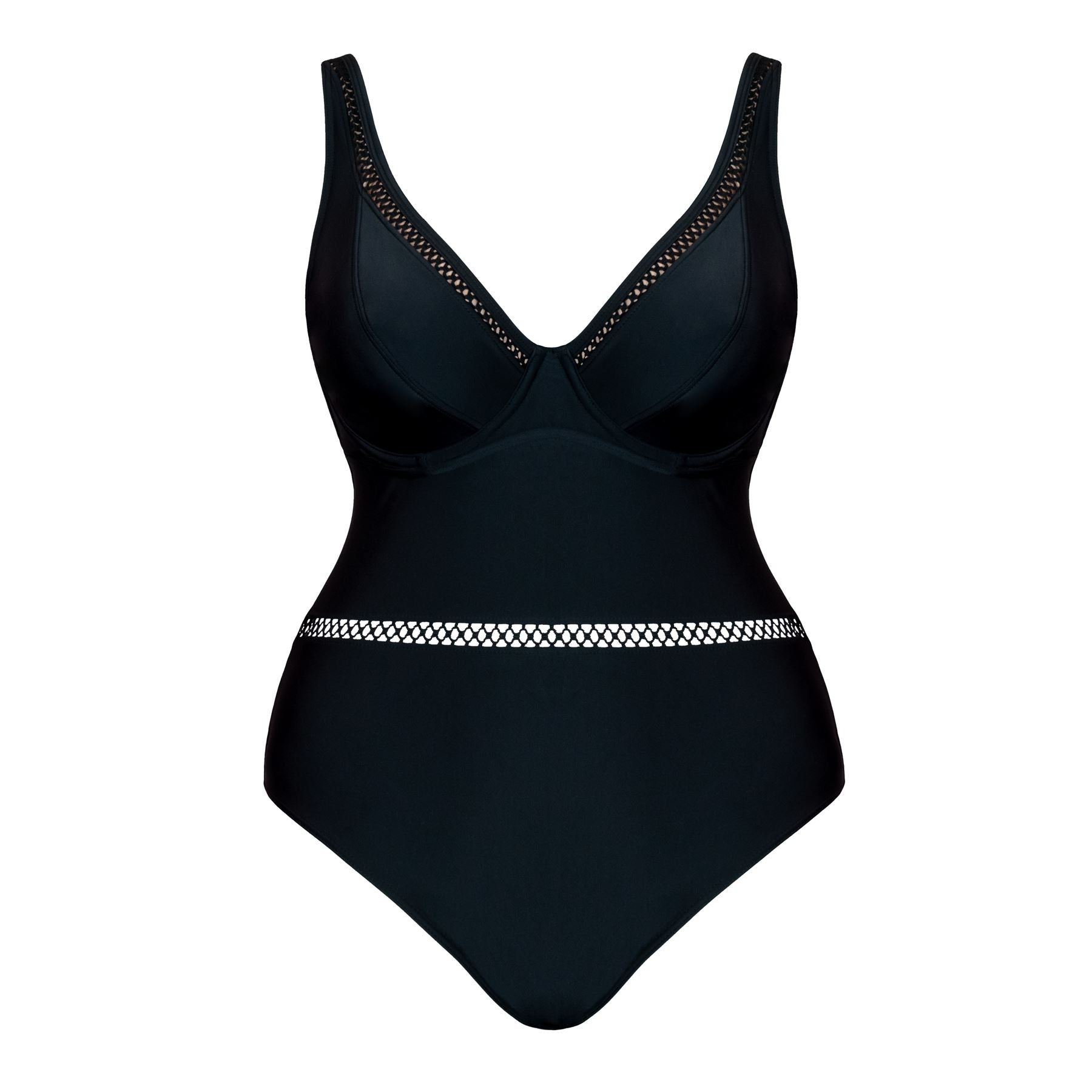 Curvy Kate Swimwear First Class plunge swimsuit in black. It features a a criss-cross design on the lined, unpadded cups, along the back and around the centre. The swimsuit is underwired, with a snap clasp fastening and straps which are fully adjustable and detachable at the back. It can be worn halterneck, with normal or crossover straps.