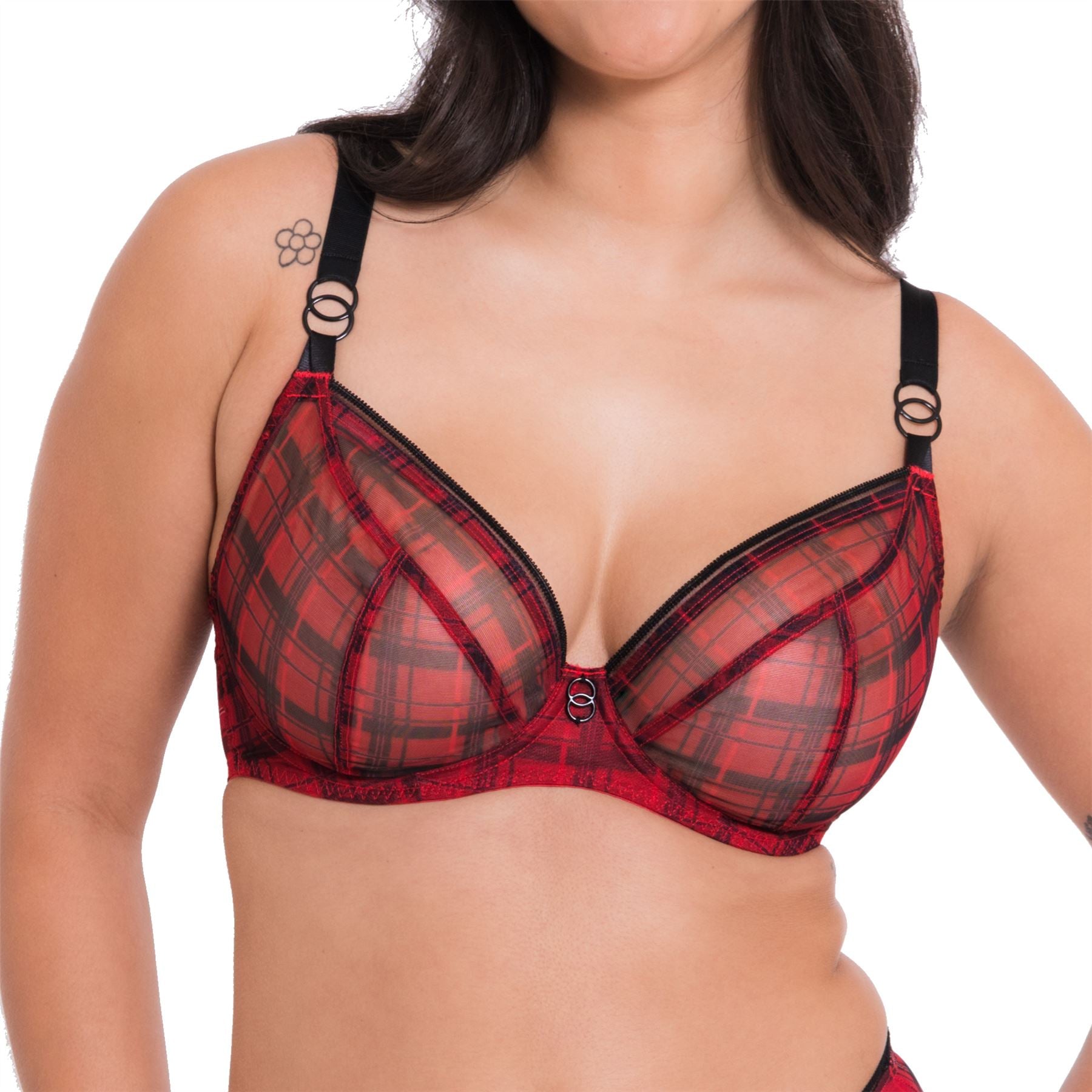 Curvy Kate Lifestyle plunge bra in check print. It features sheer, three section cups and fully adjustable straps. The bra is underwired and unpadded, with circular strap detail.