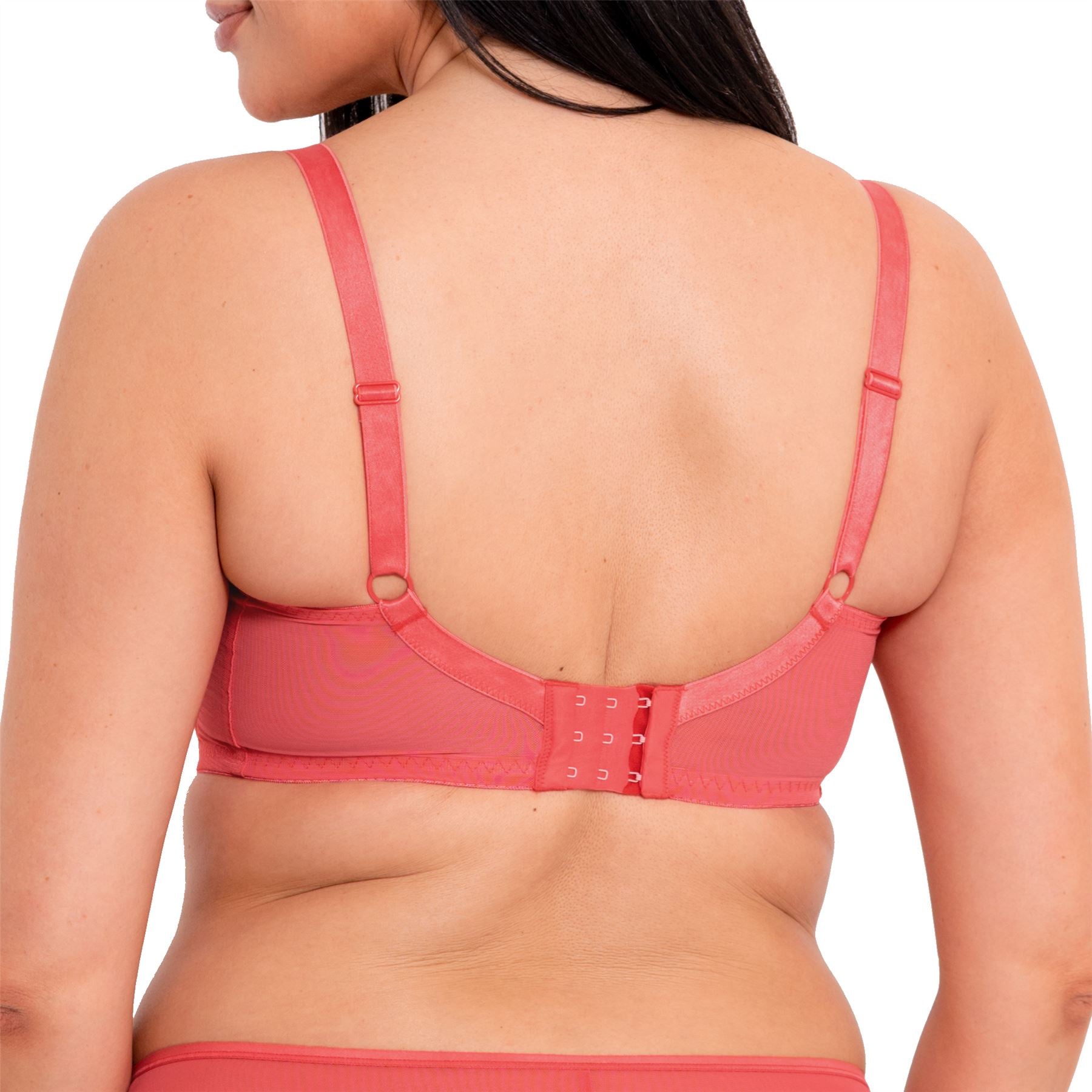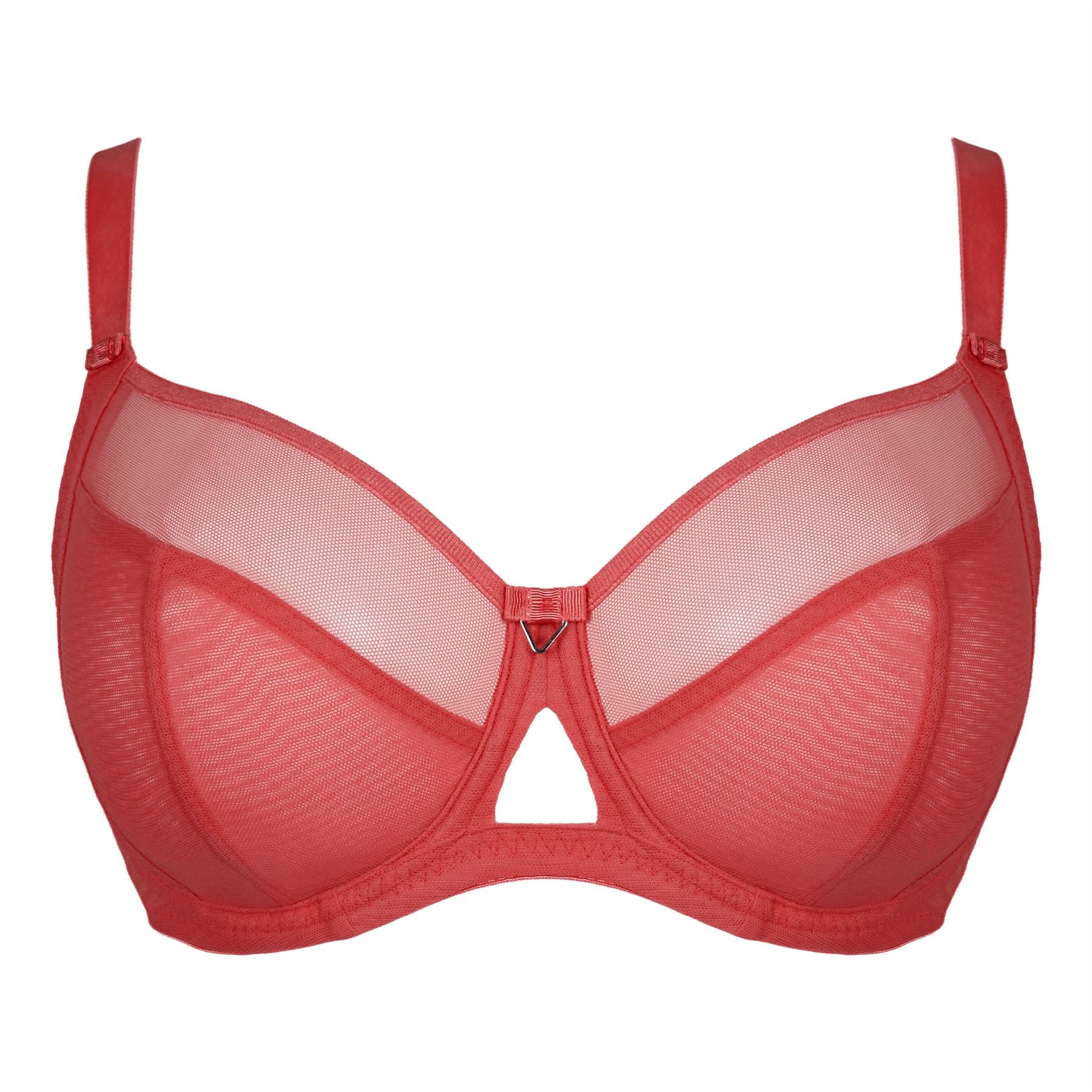 Curvy Kate Victory balcony bra in papaya. It features a four section, semi-sheer mesh cup, which is unpadded. The bra is underwired, with bow and metal detail and has a built in side sling for additional support.