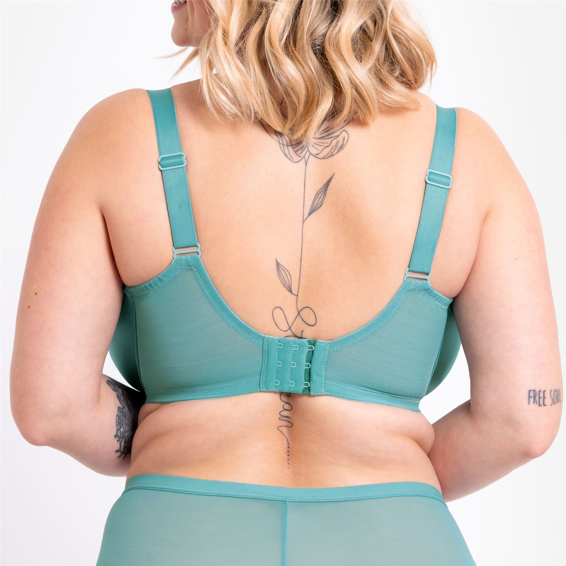 Curvy Kate WonderFully full cup side support bra in mineral blue. It features four section, unpadded cups and fully adjustable straps. The bra is underwired, with a mesh top section and a crossover centre front.