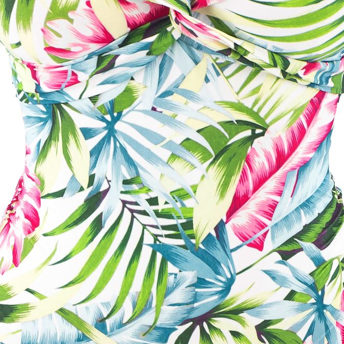 Fantasie Swimwear Langkawi twist front swimsuit in white. It has lined, unpadded cups and adjustable straps. The swimsuit features pink, blue and green tones, concealed underwires, drawstring adjustable leg and a scoop back.