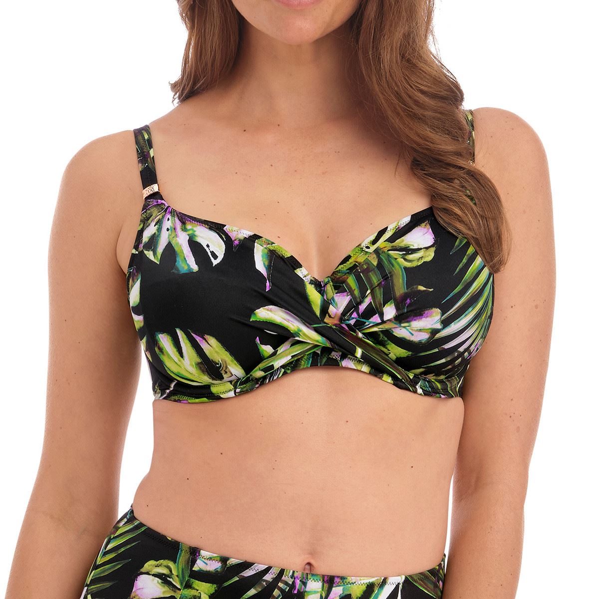 Fantasie Swimwear Palm Valley full cup bikini top in black. It features leafy palm print, wrap over front and fully adjustable straps. The bikini top is underwired, with lined, unpadded cups and a snap clasp fastening at the back.