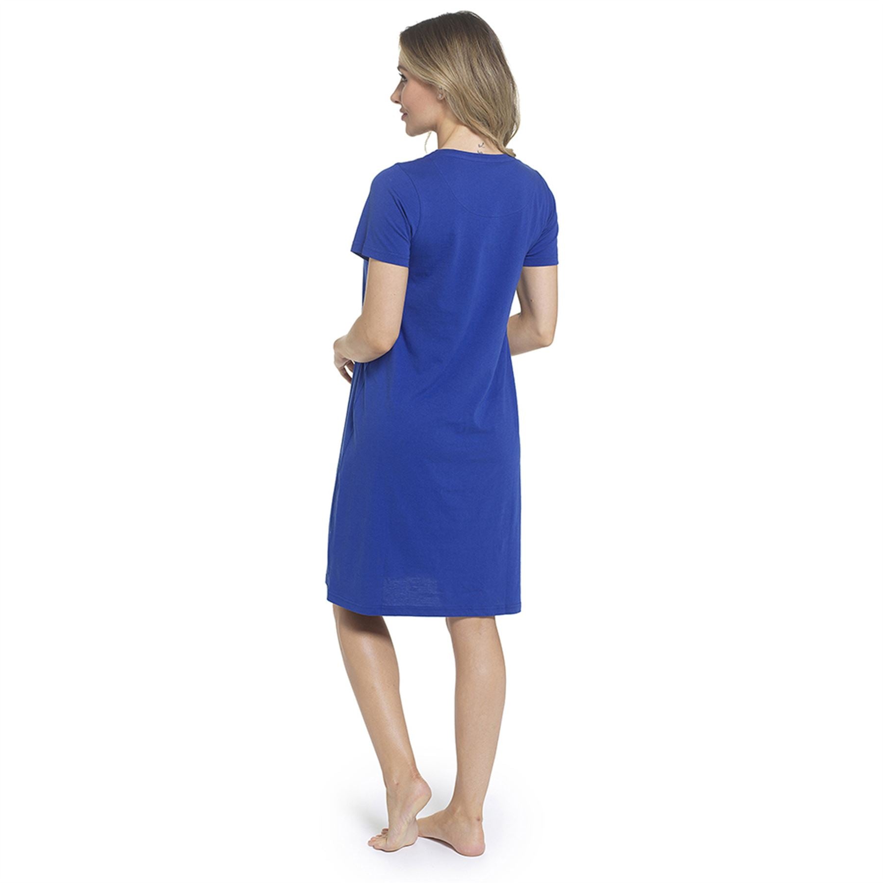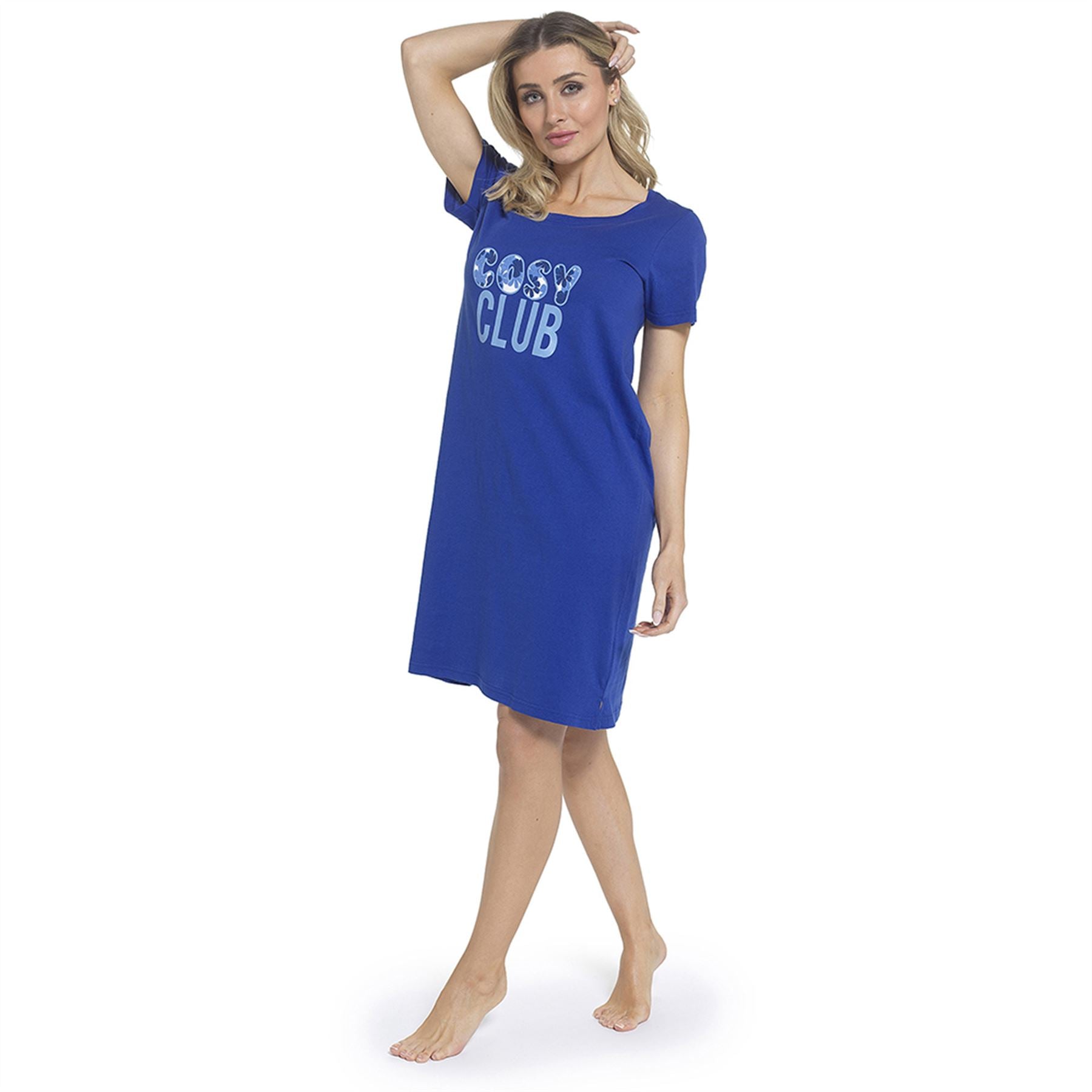 Women's short sleeve nightie in dazzling blue, featuring 'Cosy Club' slogan on the front.