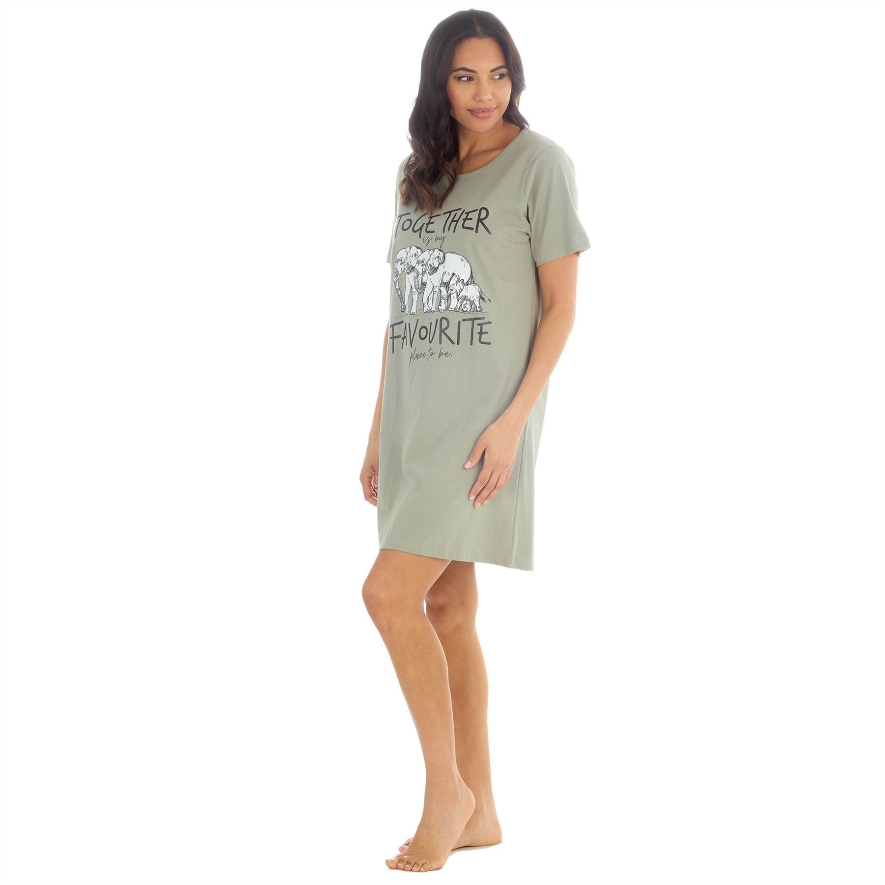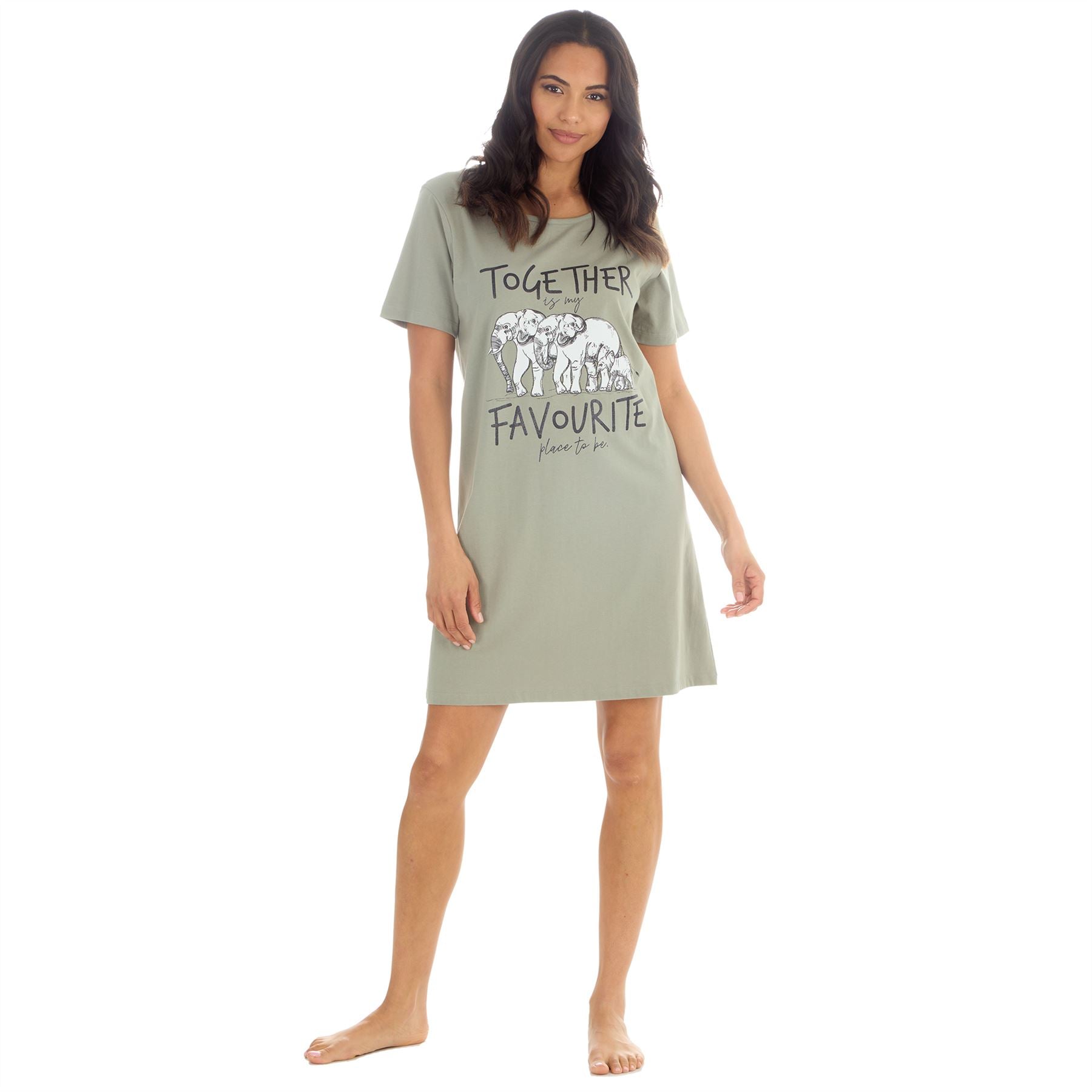 Women's nightdress in khaki, with elephant print and 'Together Is My Favourite Place To Be' slogan.