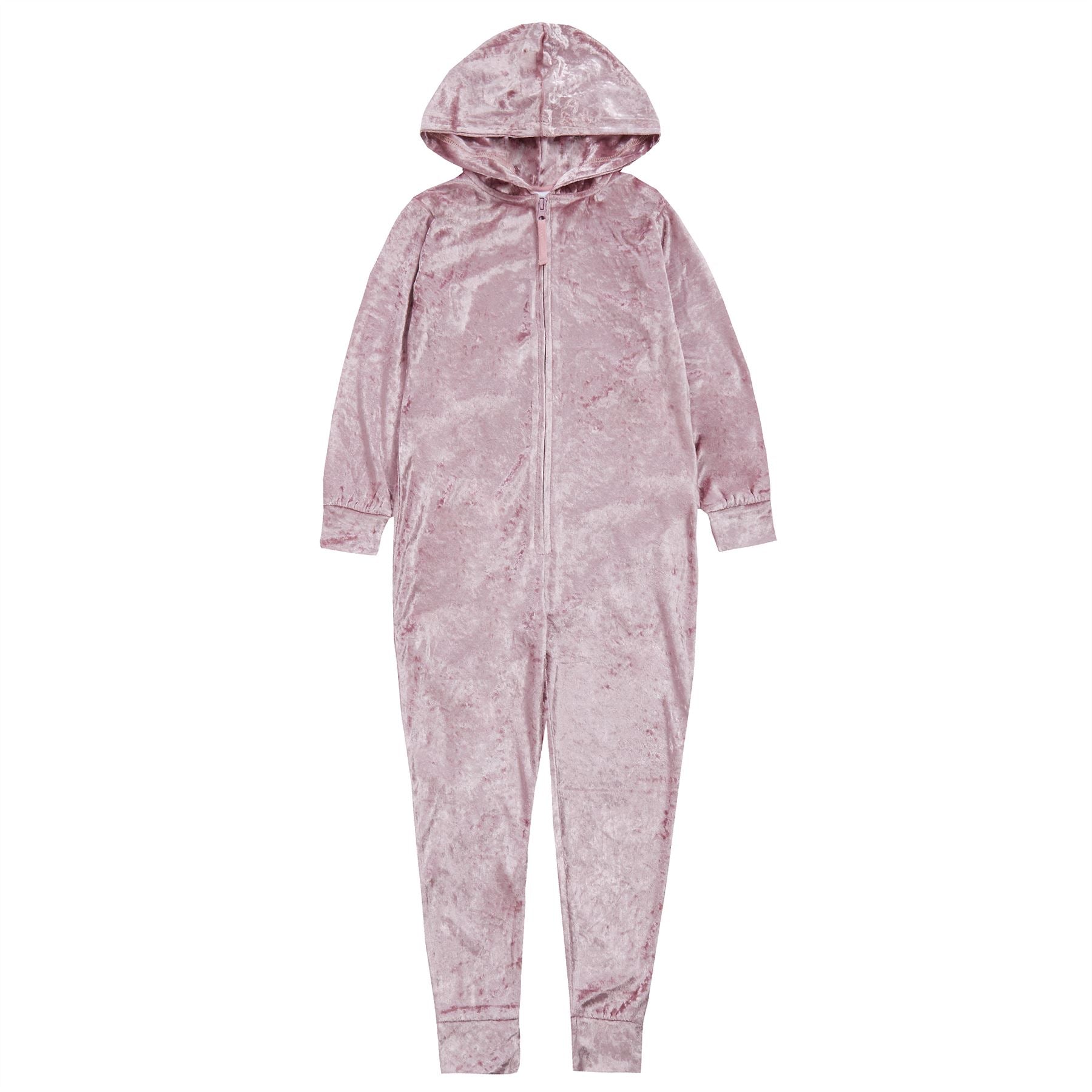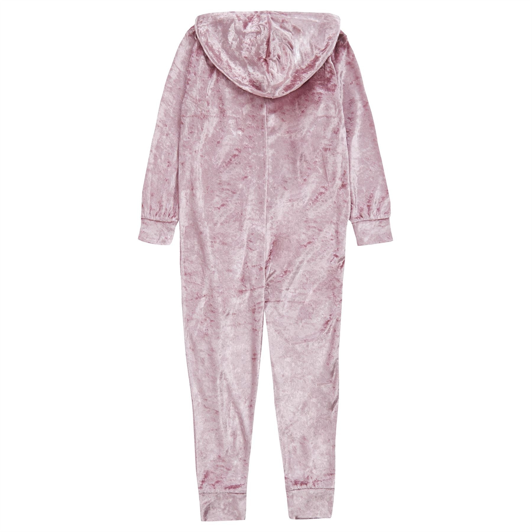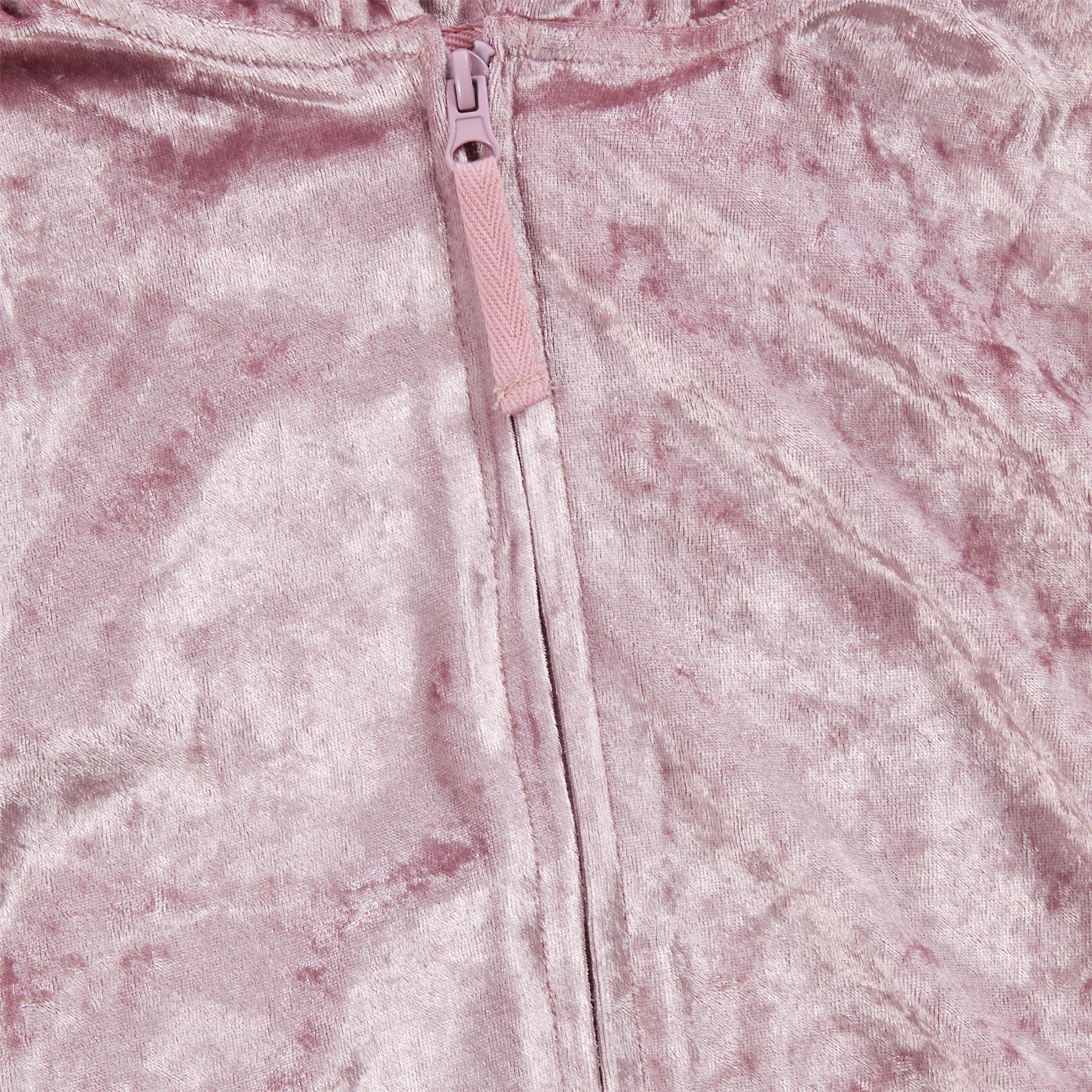 Girls' lightweight crushed velvet onesie in pink, with a zip up front and hood.