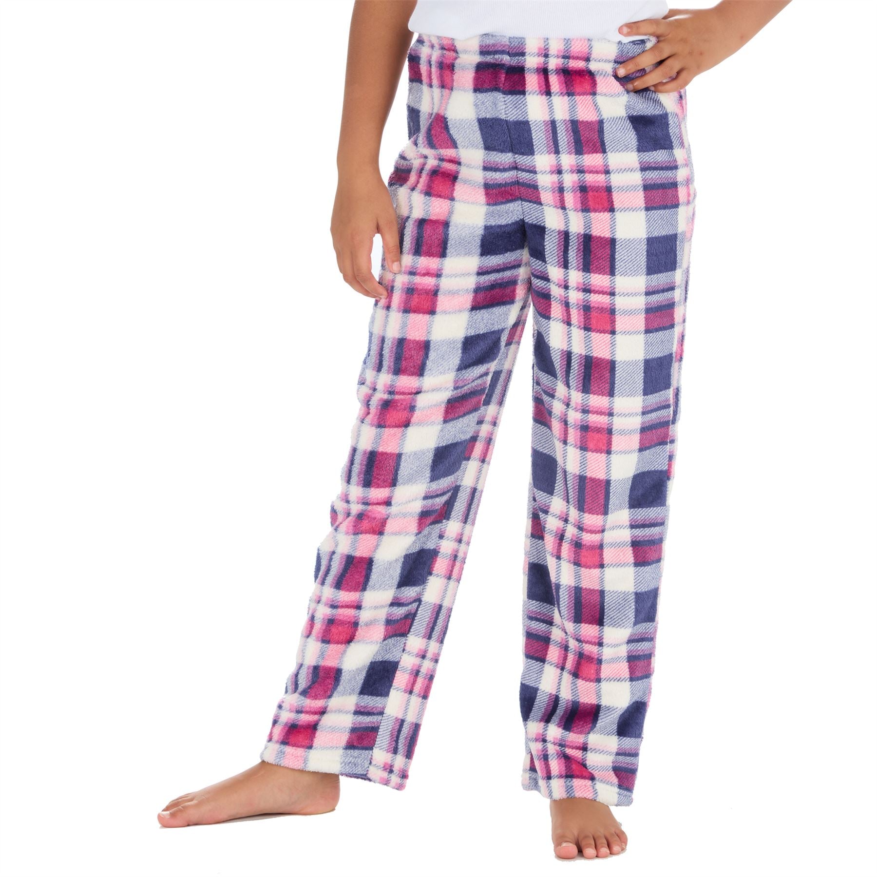 Girls' soft handle fleece lounge pants with an elasticated waist and blue check print.