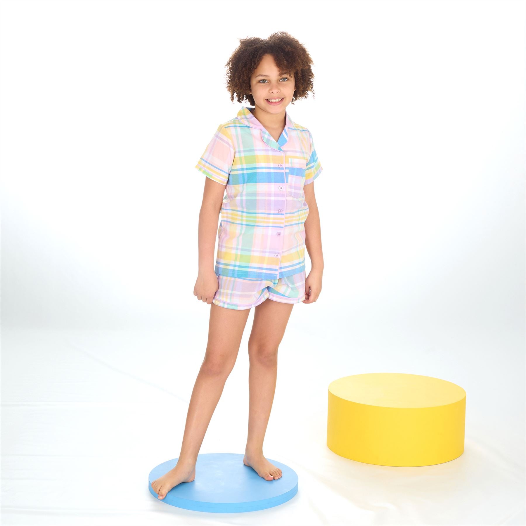 Girls' yarn dyed woven check pyjama top and shorts in pink, with a button through front, chest pocket and drawstring elasticated waistband.