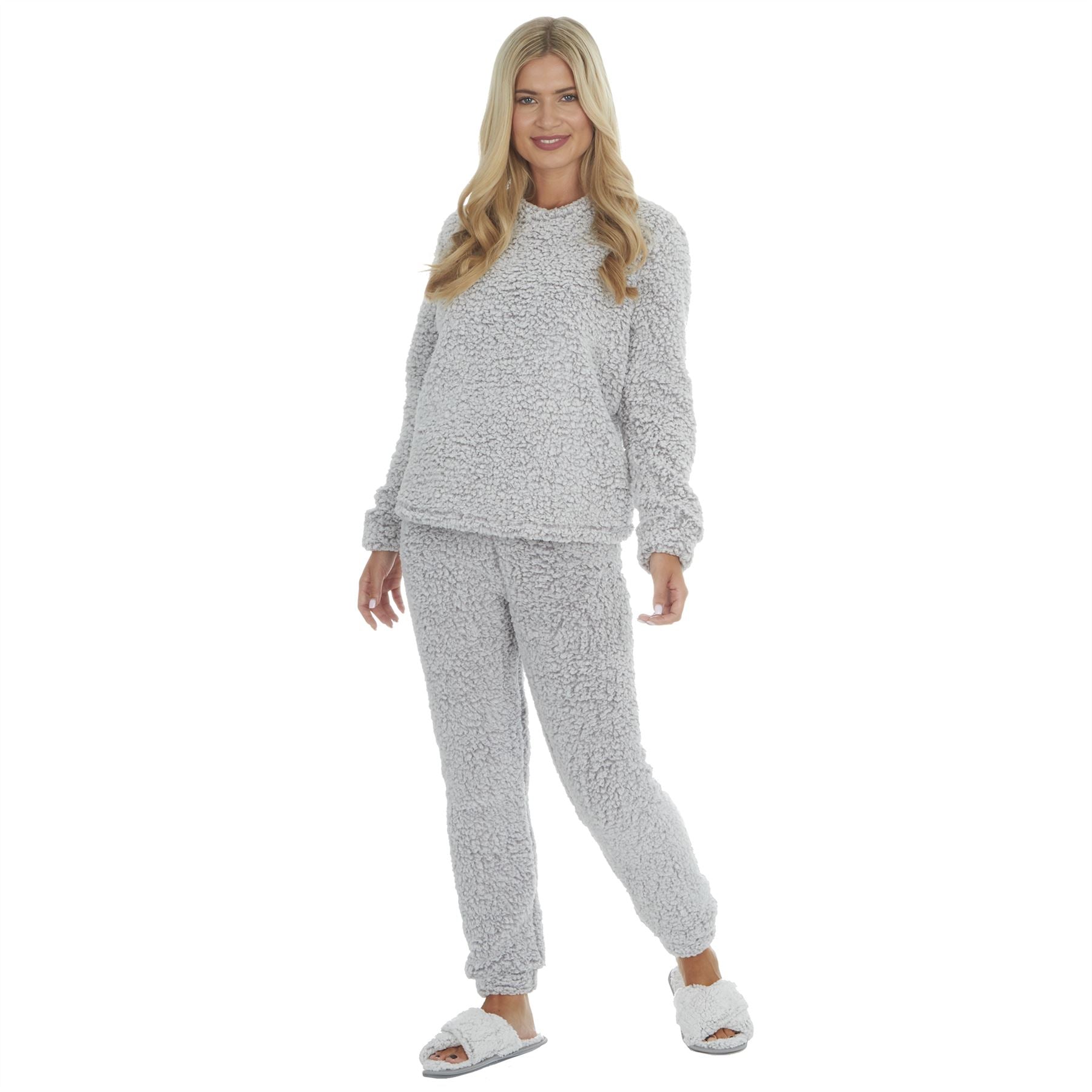Women's grey borg fleece pyjamas, with a round neck and drawstring elasticated waist.