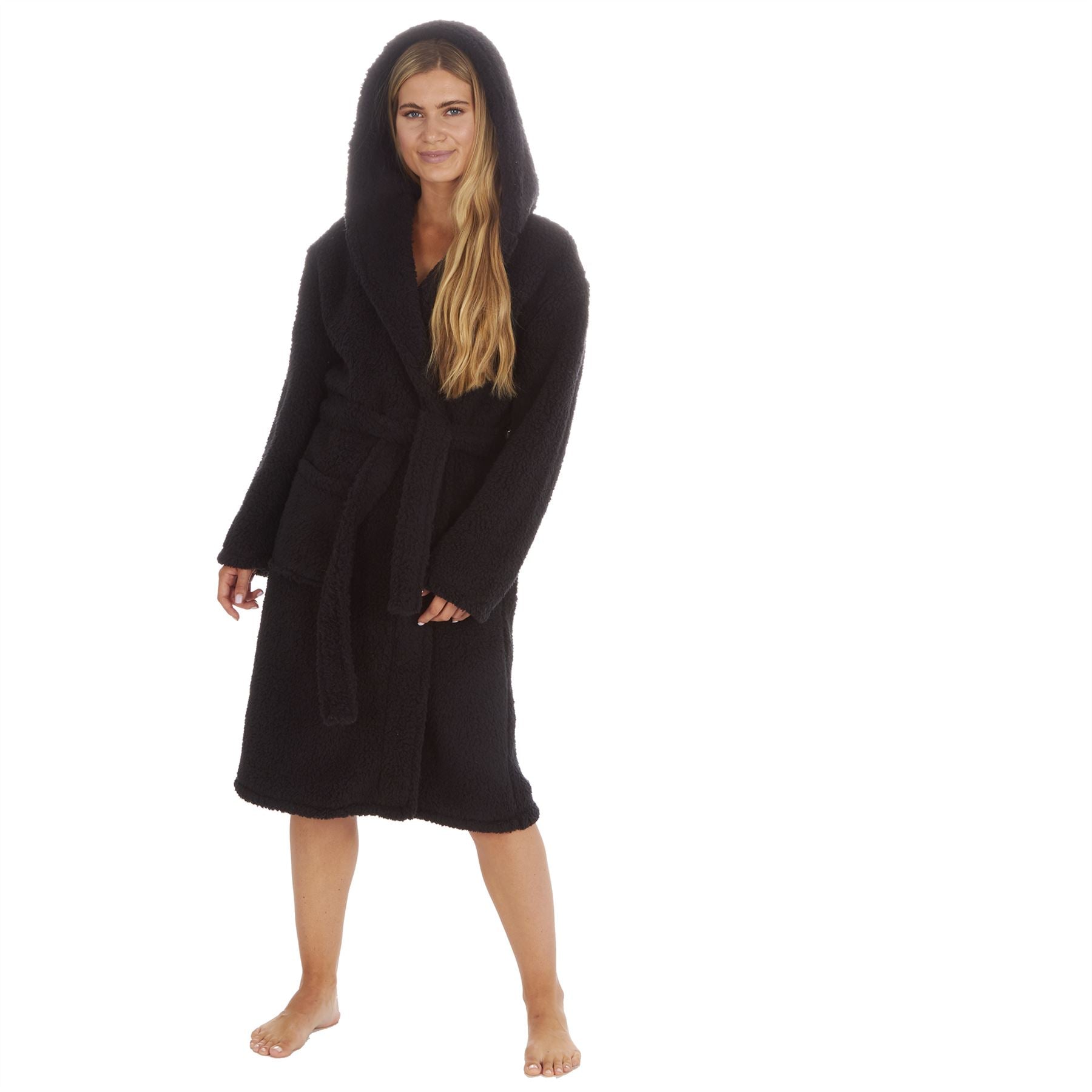 Women's borg fleece hooded robe, in black. It has a pocket each side and a cord tie fastening.
