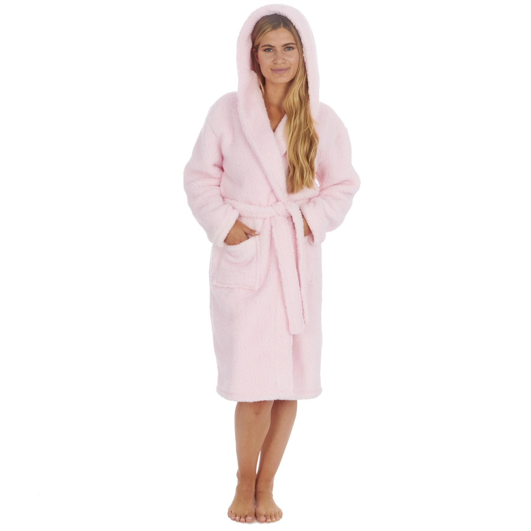 Women's borg fleece hooded robe, in pink. It has a pocket each side and a cord tie fastening.