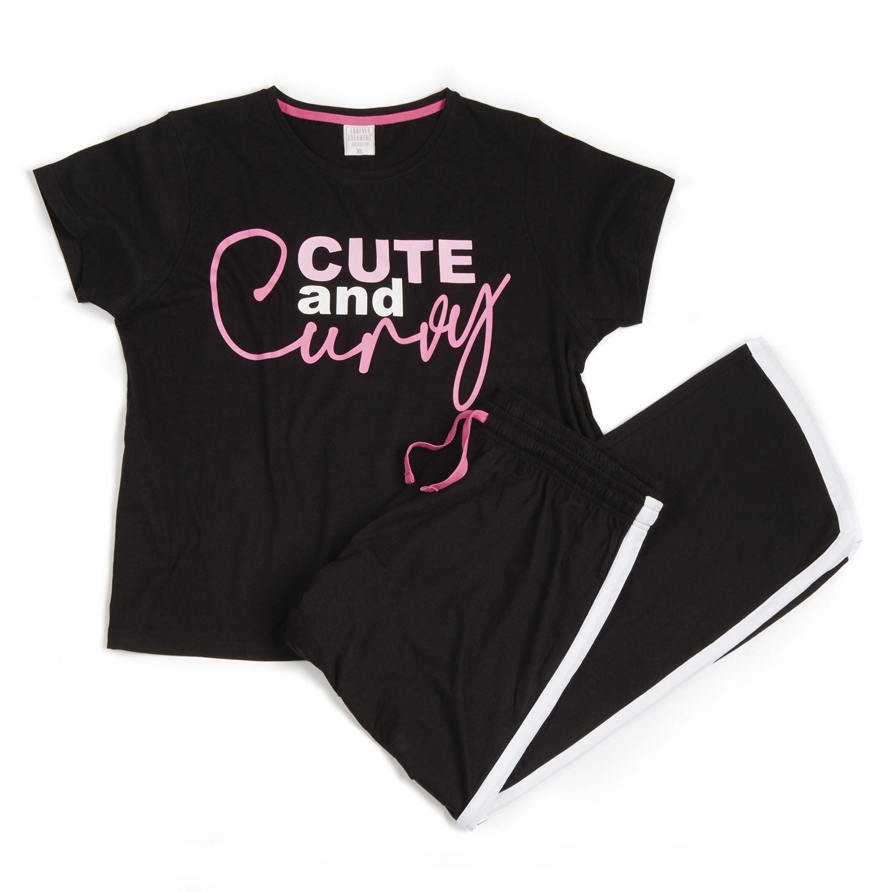 Women's pyjama set, with 'Cute and Curvy' slogan and matching bottoms.