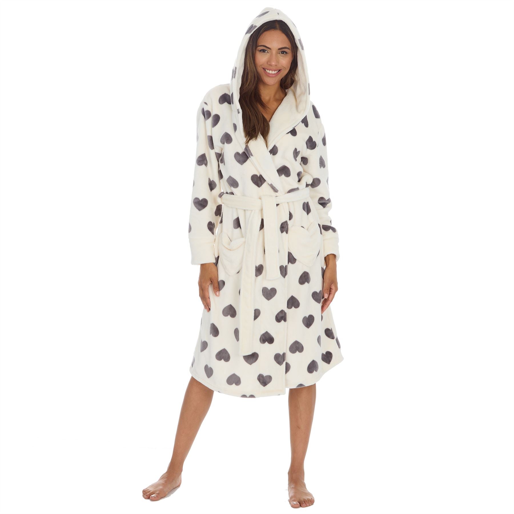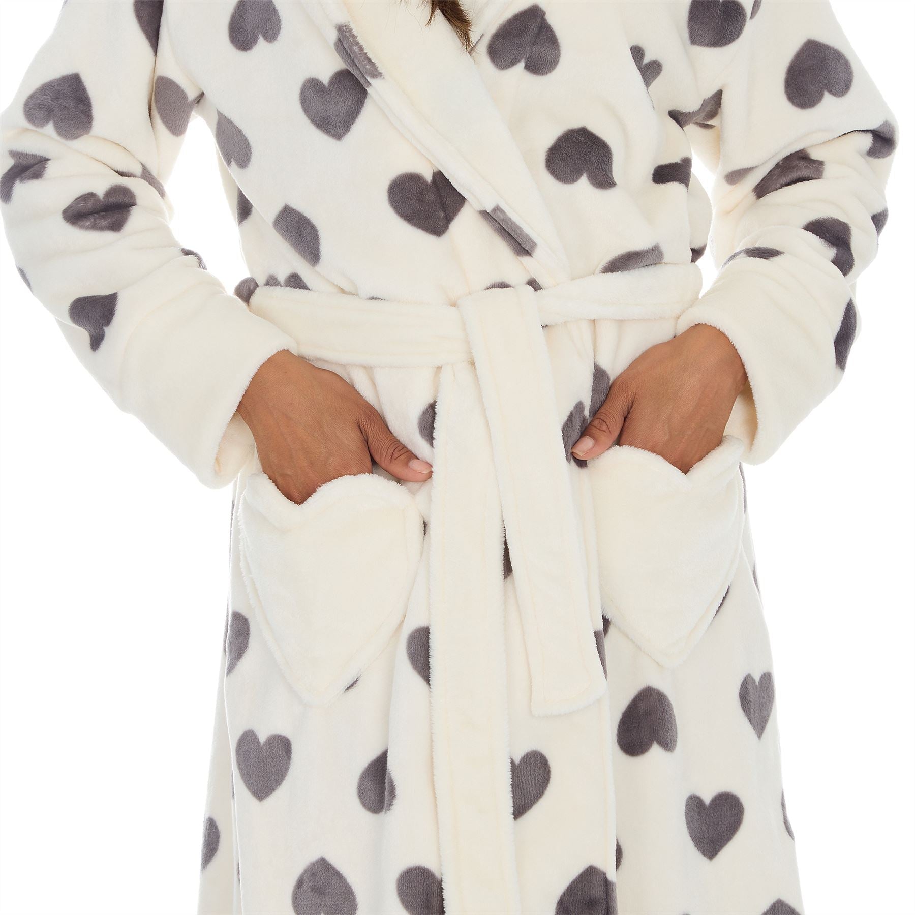 Women's plush fleece robe in cream with grey hearts. It has a hood, heart shaped pockets and a belt tie fastening.