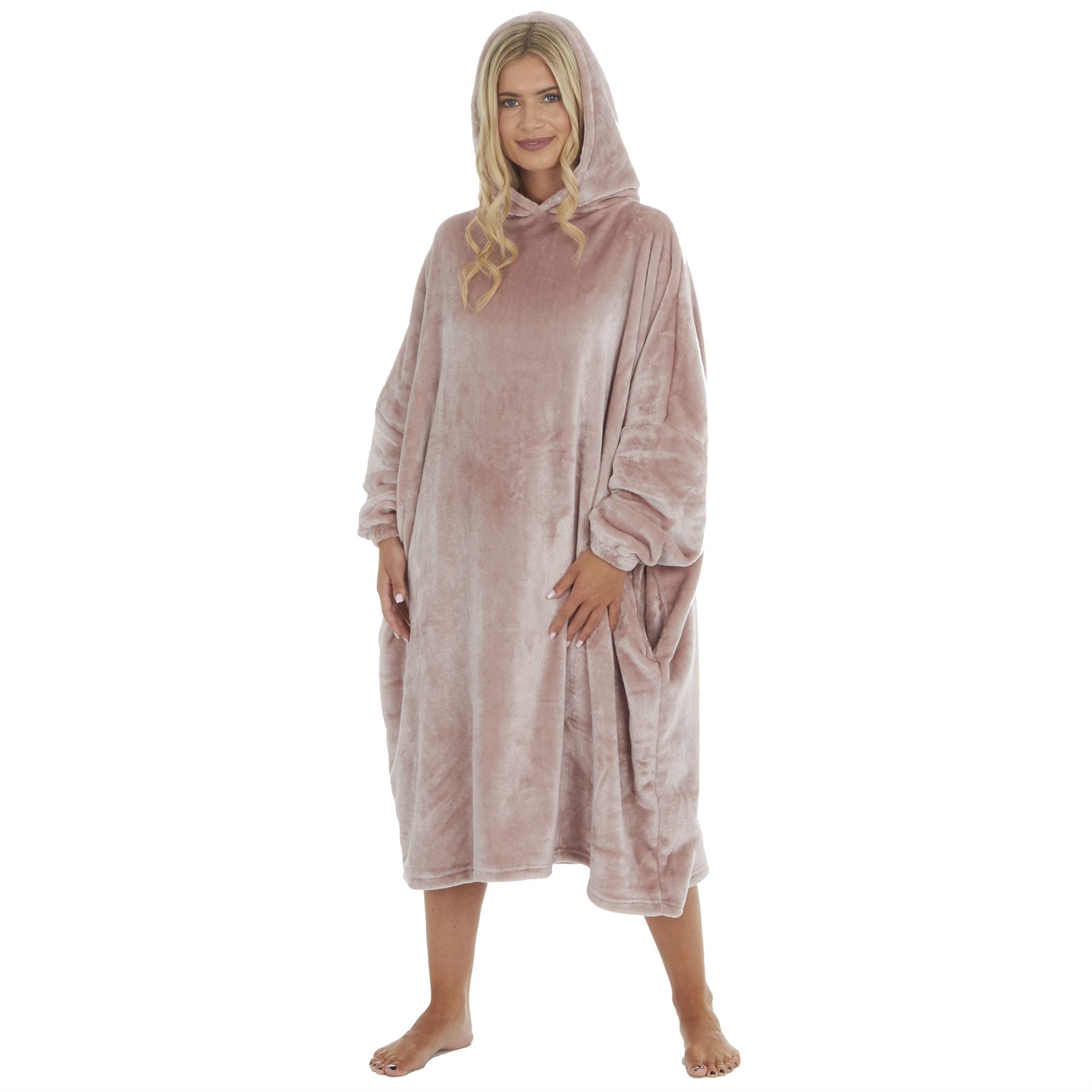 Women's luxury shimmer fleece hoodie in champagne pink, with pockets at the sides.