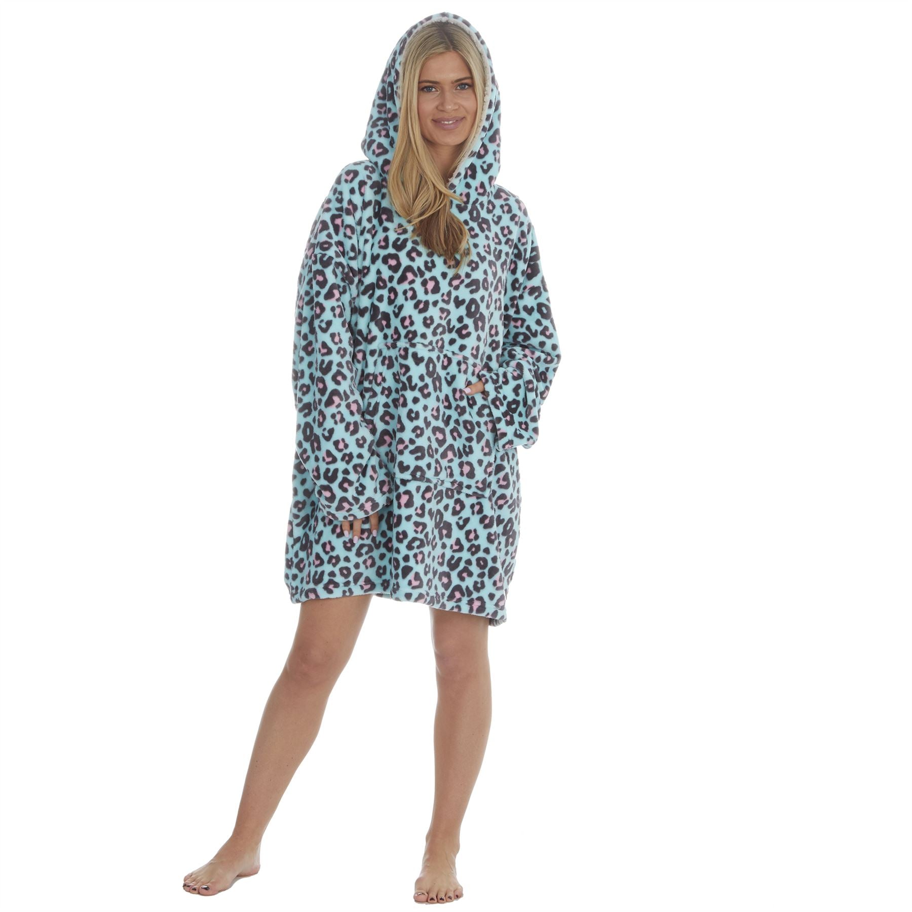 Women's aqua leopard oversized fleece hoodie. It has a sherpa lined hood and a kangaroo pocket at the front.
