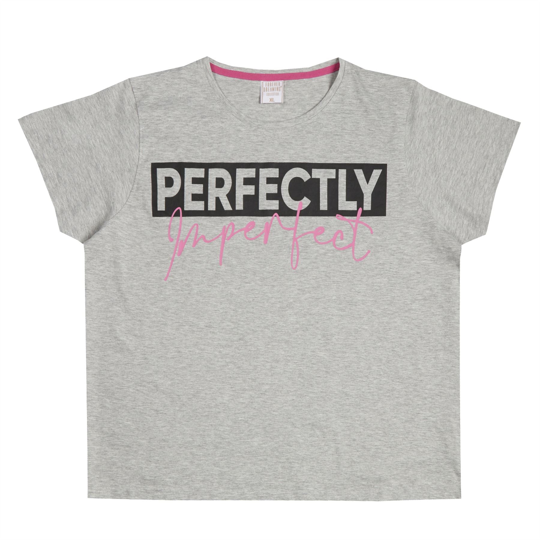 Women's pyjama set, with 'Perfectly Imperfect' slogan and matching bottoms.