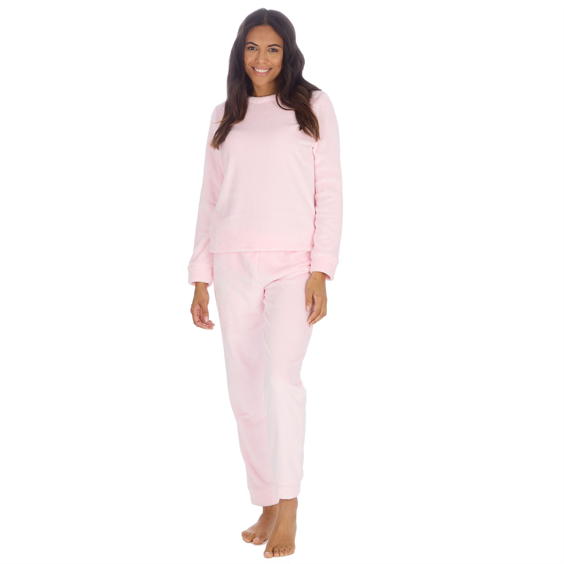 Women's plush fleece pyjama set in baby pink, featuring a round neck top and bottoms with an elasticted waist.