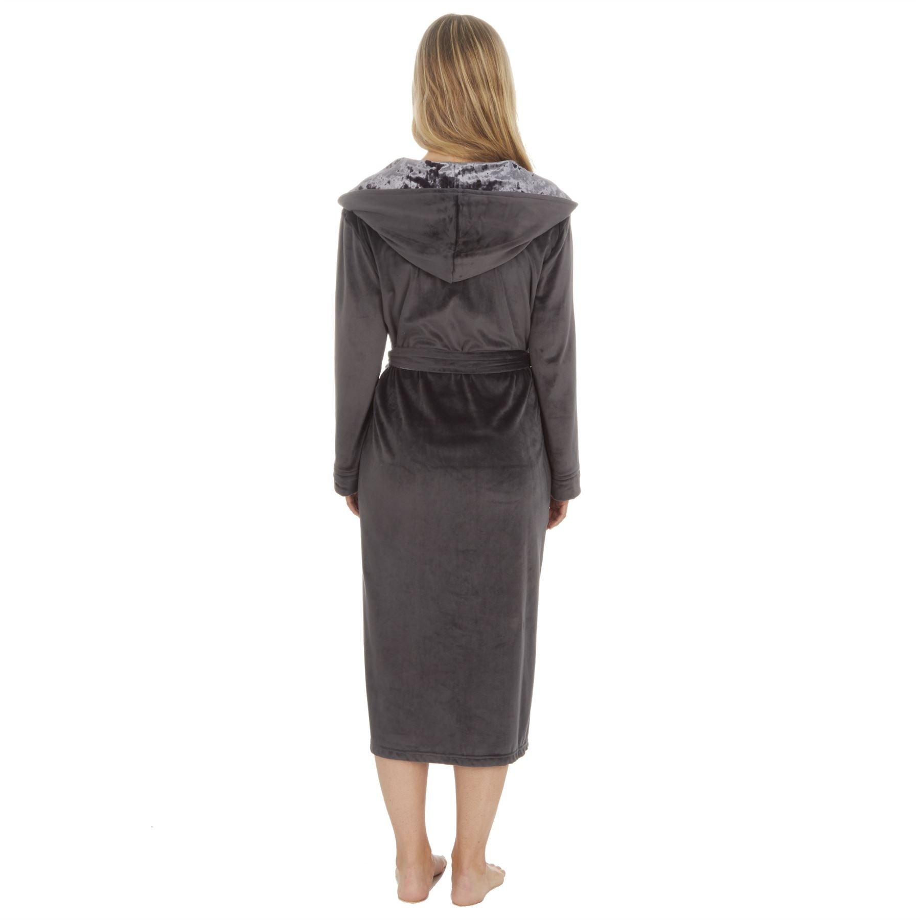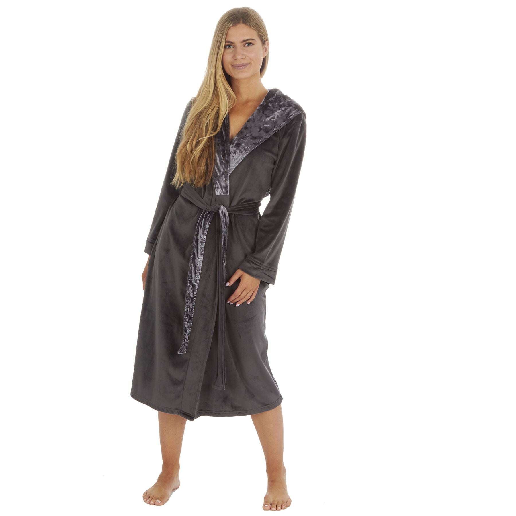 Women's plush velour contrast robe, in charcoal, with a hood and a belt fastening.