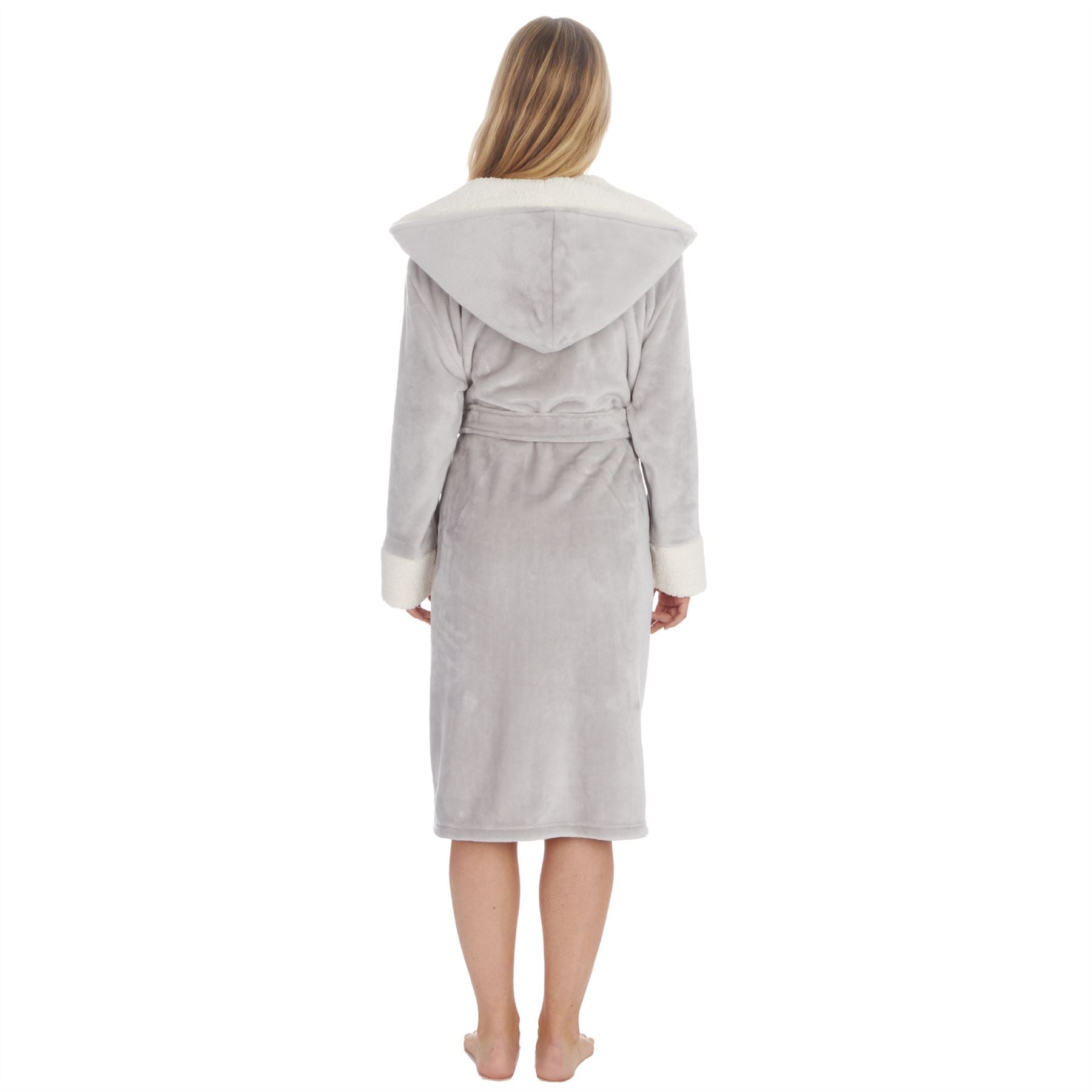 Women's shimmer hooded robe in grey, with a contrasting borg fleece lined hood and sleeves. It has a pocket each side and a belt fastening.