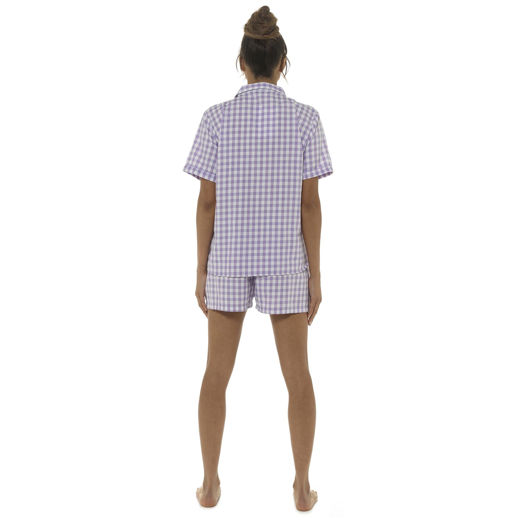 Women's short sleeve woven check pyjamas in lilac, with a button front top and matching shorts.