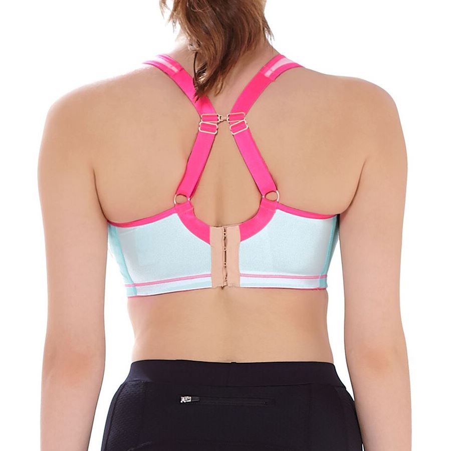 Freya Active Sonic moulded sports bra in air blue. It is underwired, with padded cups and adjustable padded straps. The bra is designed for high performance with full coverage, and features moisture management fabric and padded hook and eye fastening. It can be worn with normal straps or racerback.