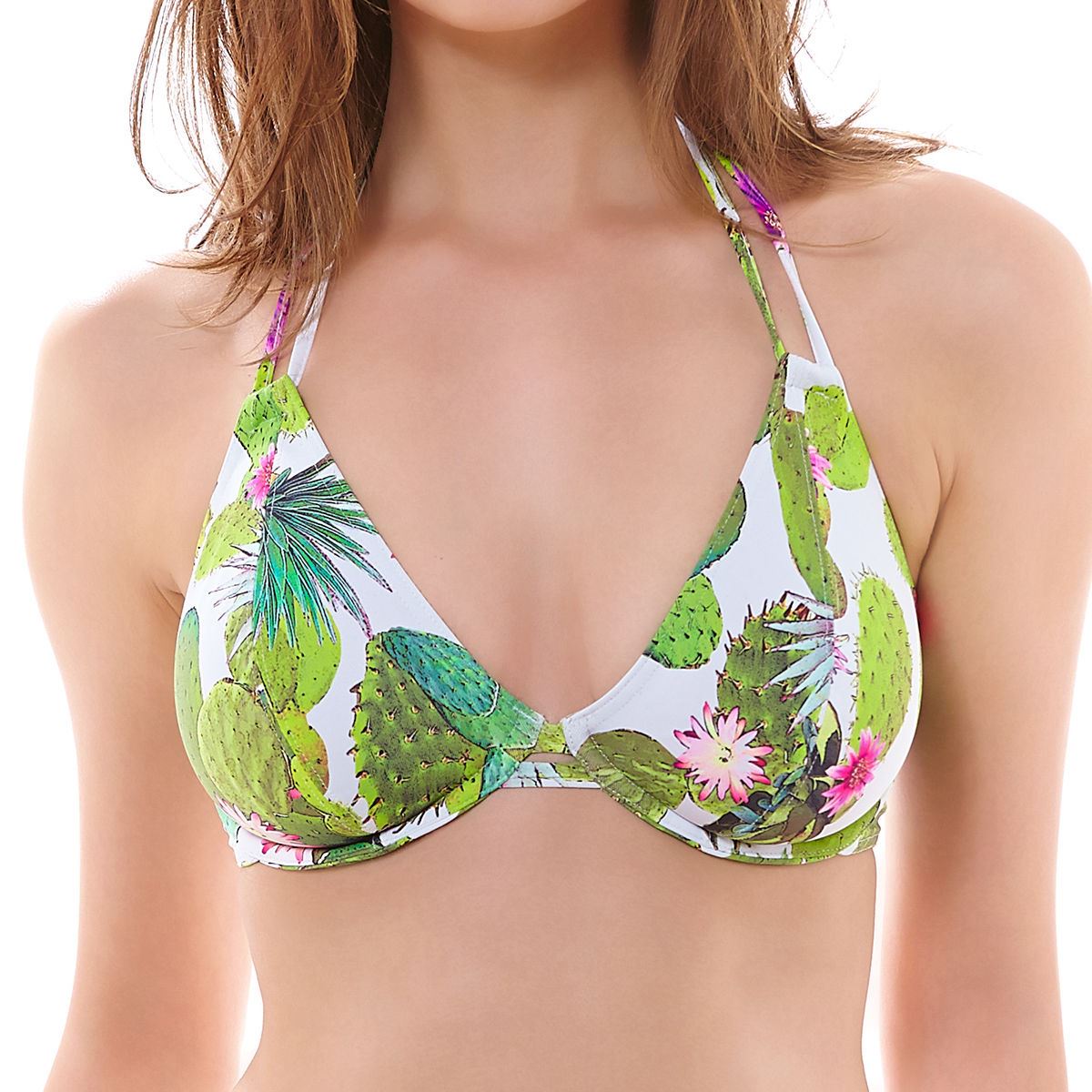 Freya Swimwear Cactus bandless bikini top. It is halterneck and underwired, with lined, unpadded cups. The bikini top has printed floral detail, a neck tie fastening and a snap clasp fastening at the back.