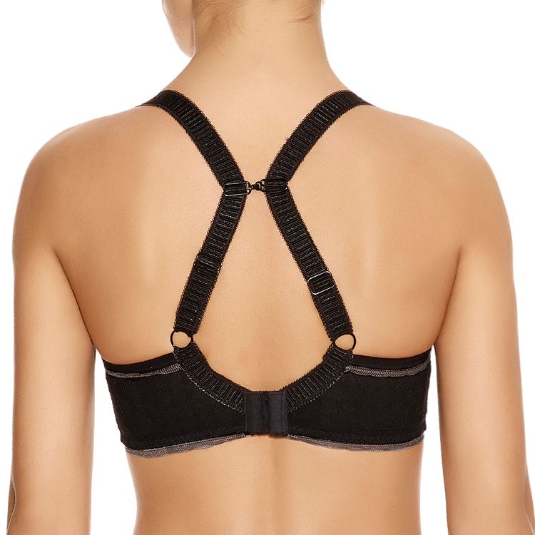 Freya Deco Vibe moulded plunge bra in black. It is underwired, with smooth, padded cups. The bra has contrasting lace edging and fully adjustable straps. It features a J hook fastening enabling it to be worn with normal straps or with a racer back.