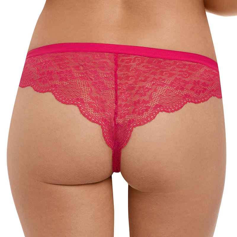 Freya Fancies Brazilian in lipstick. It has floral lace detail and a spotted ribbon bow.