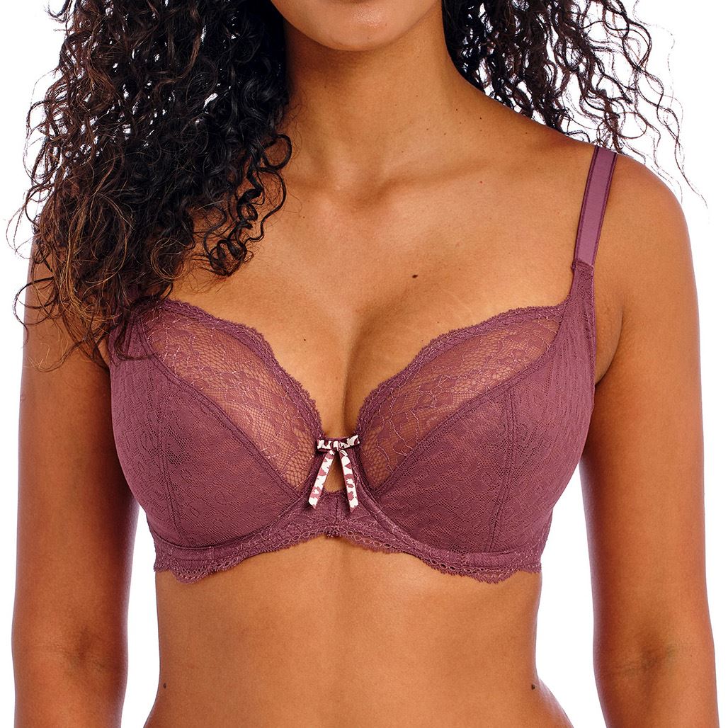 Freya Fancies plunge bra in iced mocha. It is underwired, with semi-sheer, unpadded cups. The bra features floral lace embroidery, adjustable shoulder straps and a decorative bow in the centre.