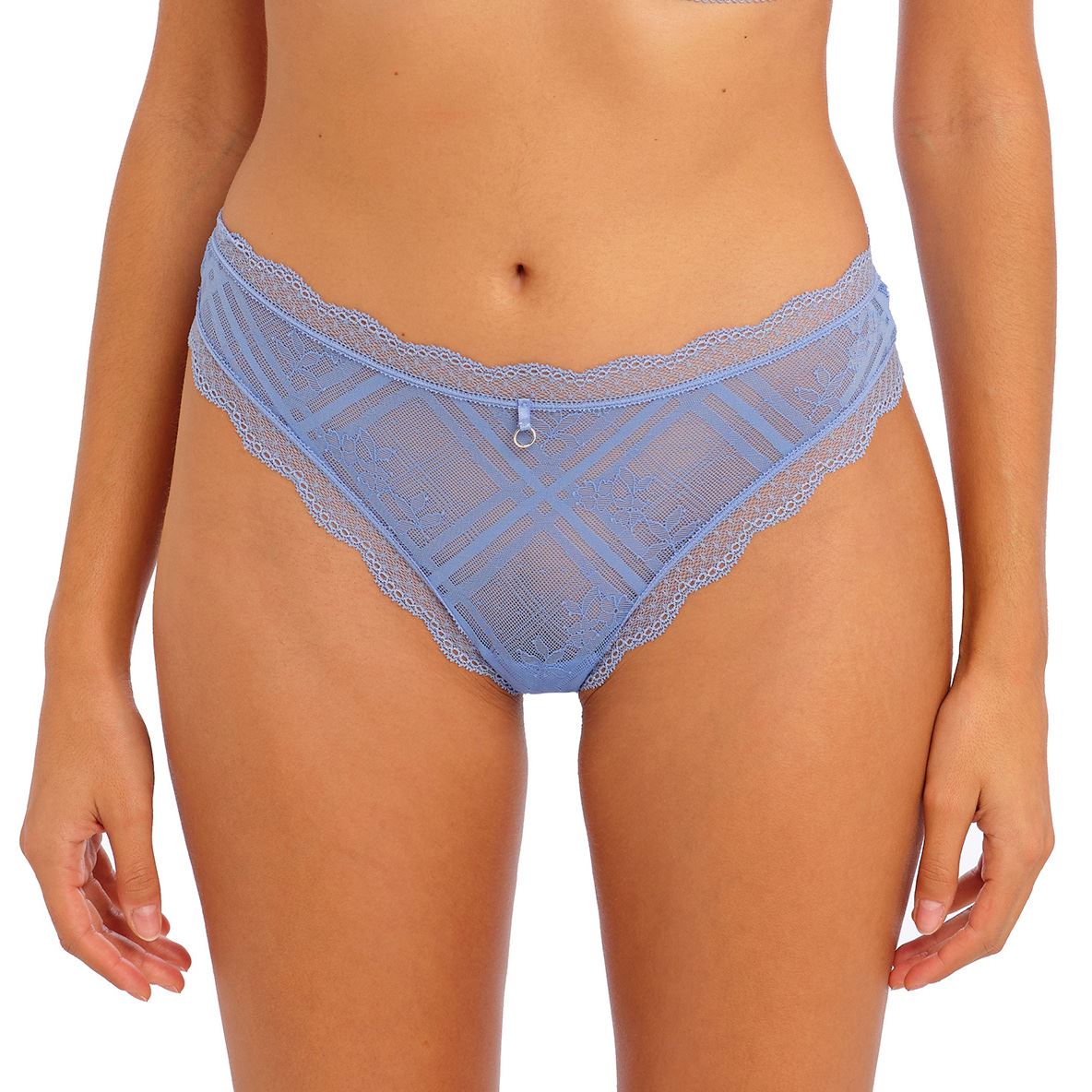 Freya Fatale Brazilian in cornflower, with a geometric floral design and a silver ring charm in the centre.