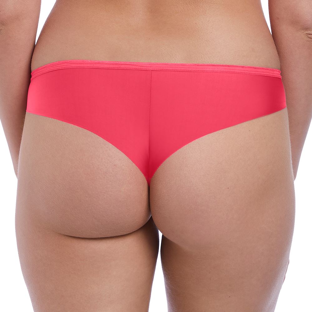 Freya Starlight Brazilian in hibiscus, featuring spots on semi sheer lace and a ribbon bow in the centre.