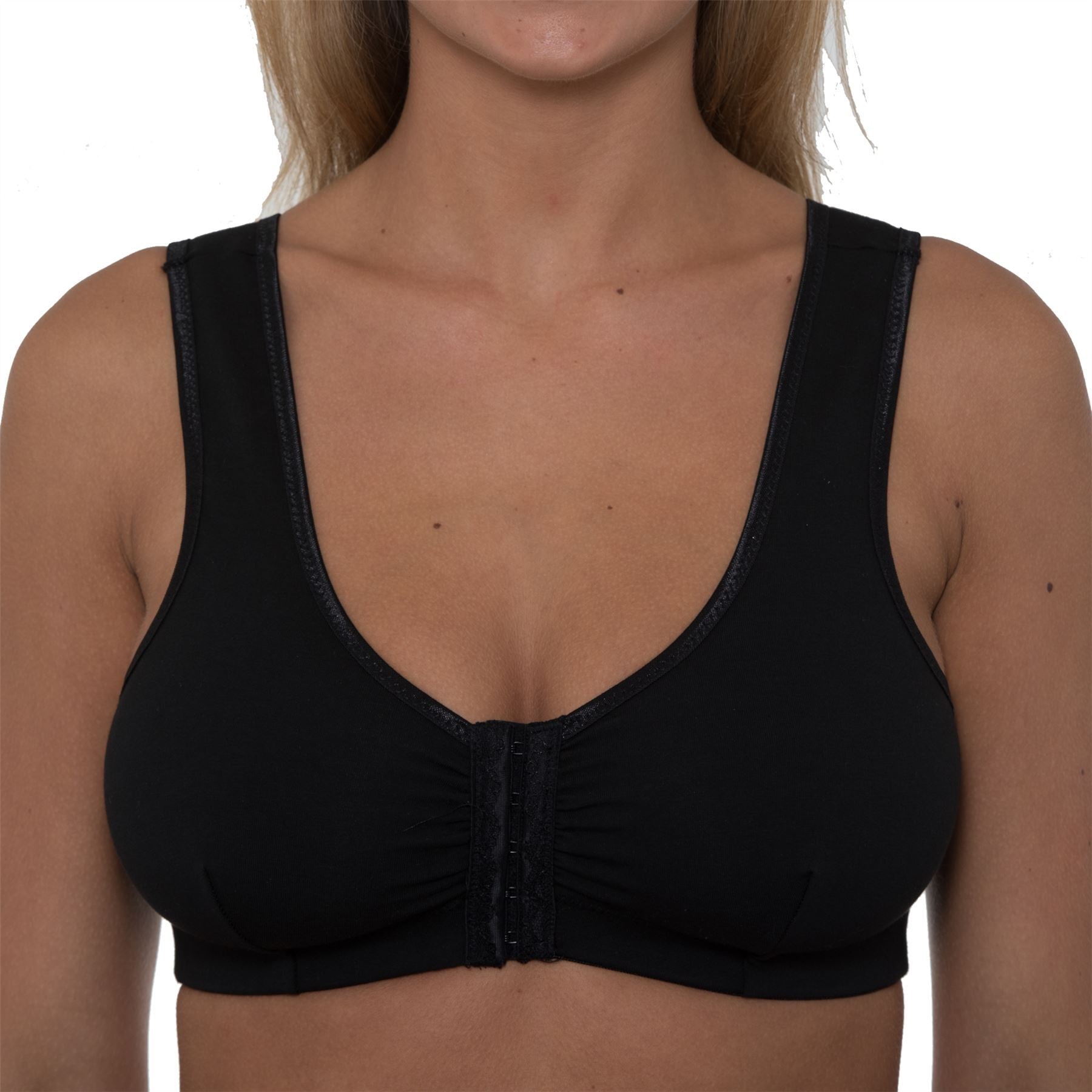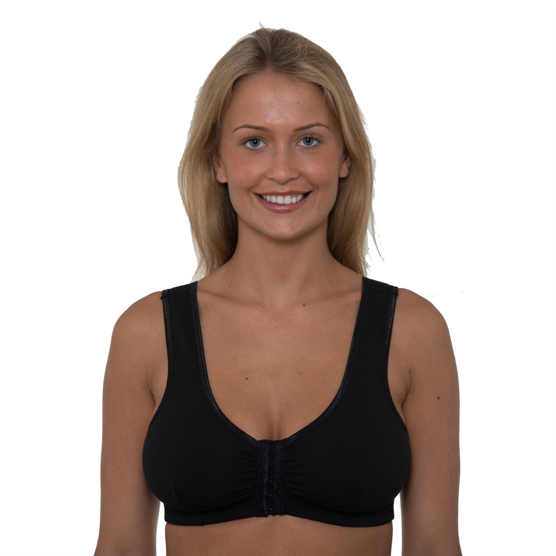 Gemm front fastening bra in black. It is non wired, with an elasticated underband and wide straps, which are not adjustable. The bra has soft, unpadded stretch cups and a 5 hook and eye fastening at the front. One band size fits B-DD cups.