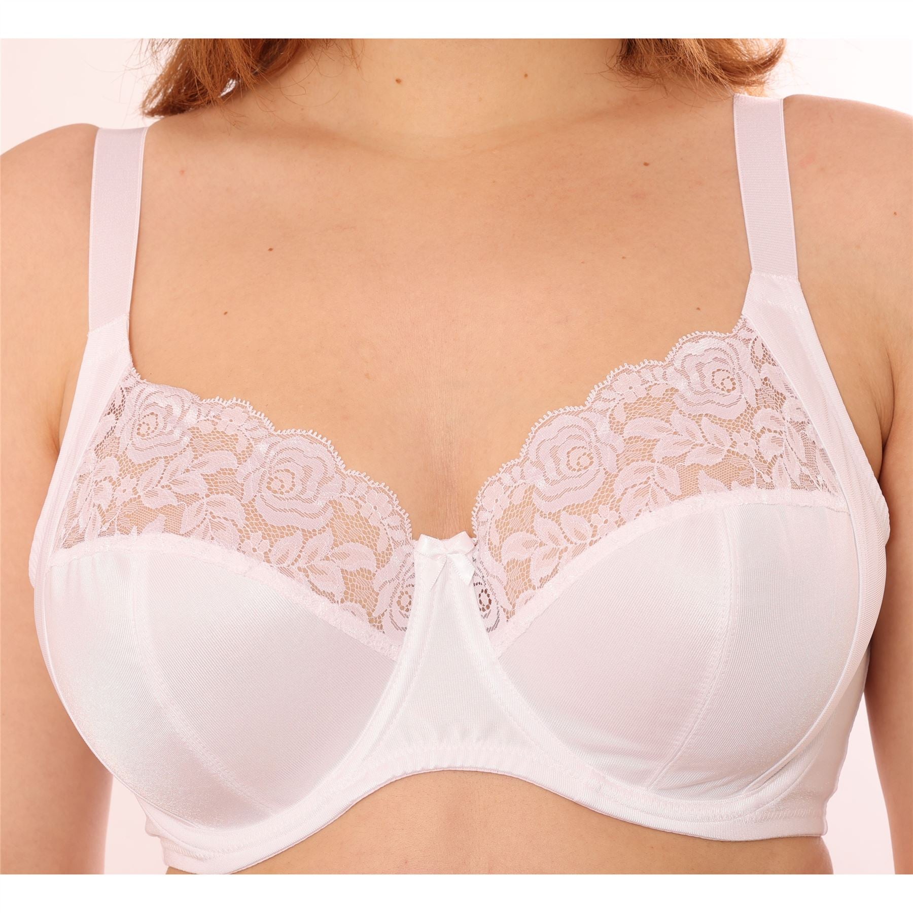 Gemm full cup satin bra in white. It is underwired, with a floral lace top section and a ribbon bow. The bra has unpadded, four section cups, fully adjustable straps and a hook and eye fastening.