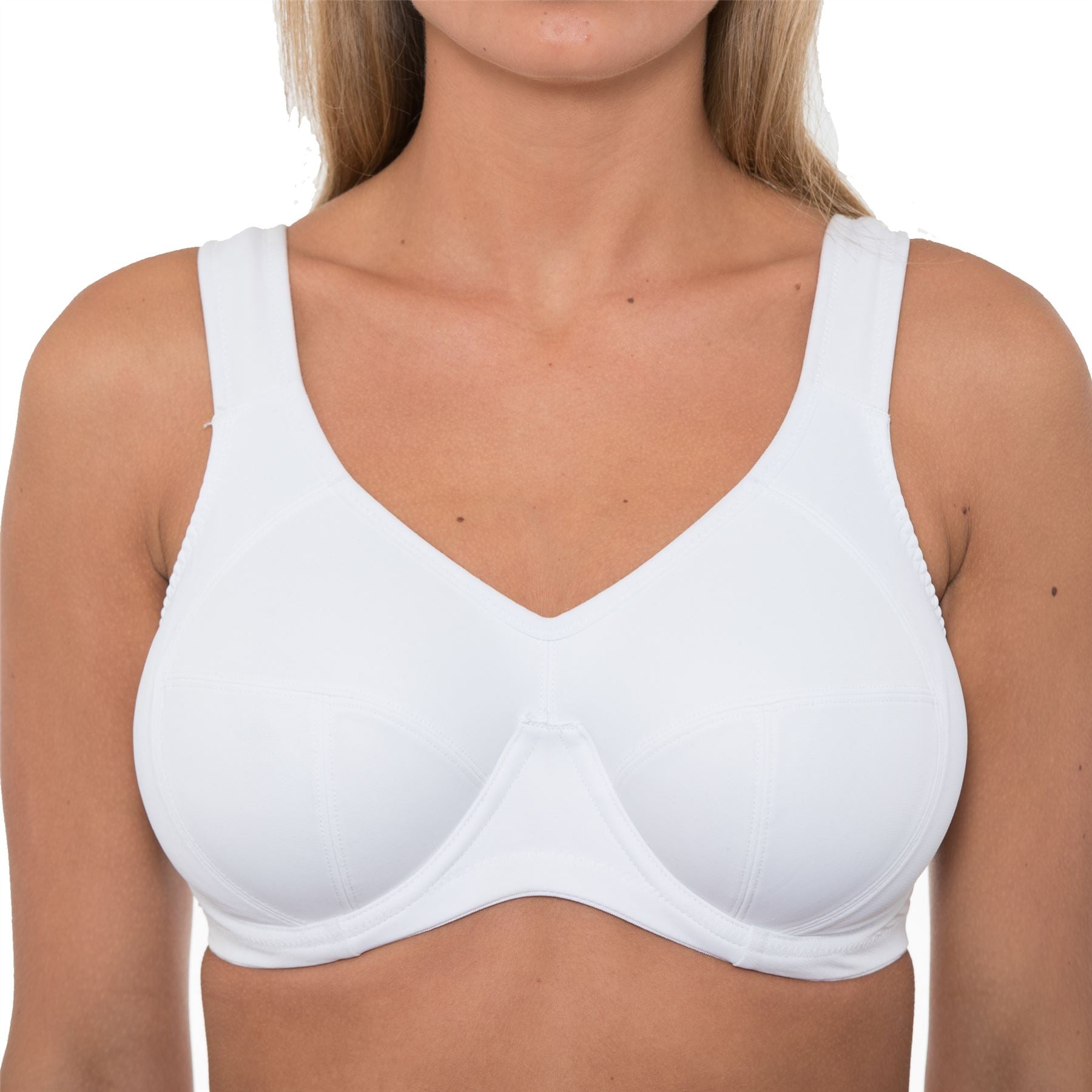 Gemm sports bra in white. It is underwired and offers high impact support. The bra features breathable mesh panels and half adjustable padded straps. It has unpadded cups and a hook and eye fastening.