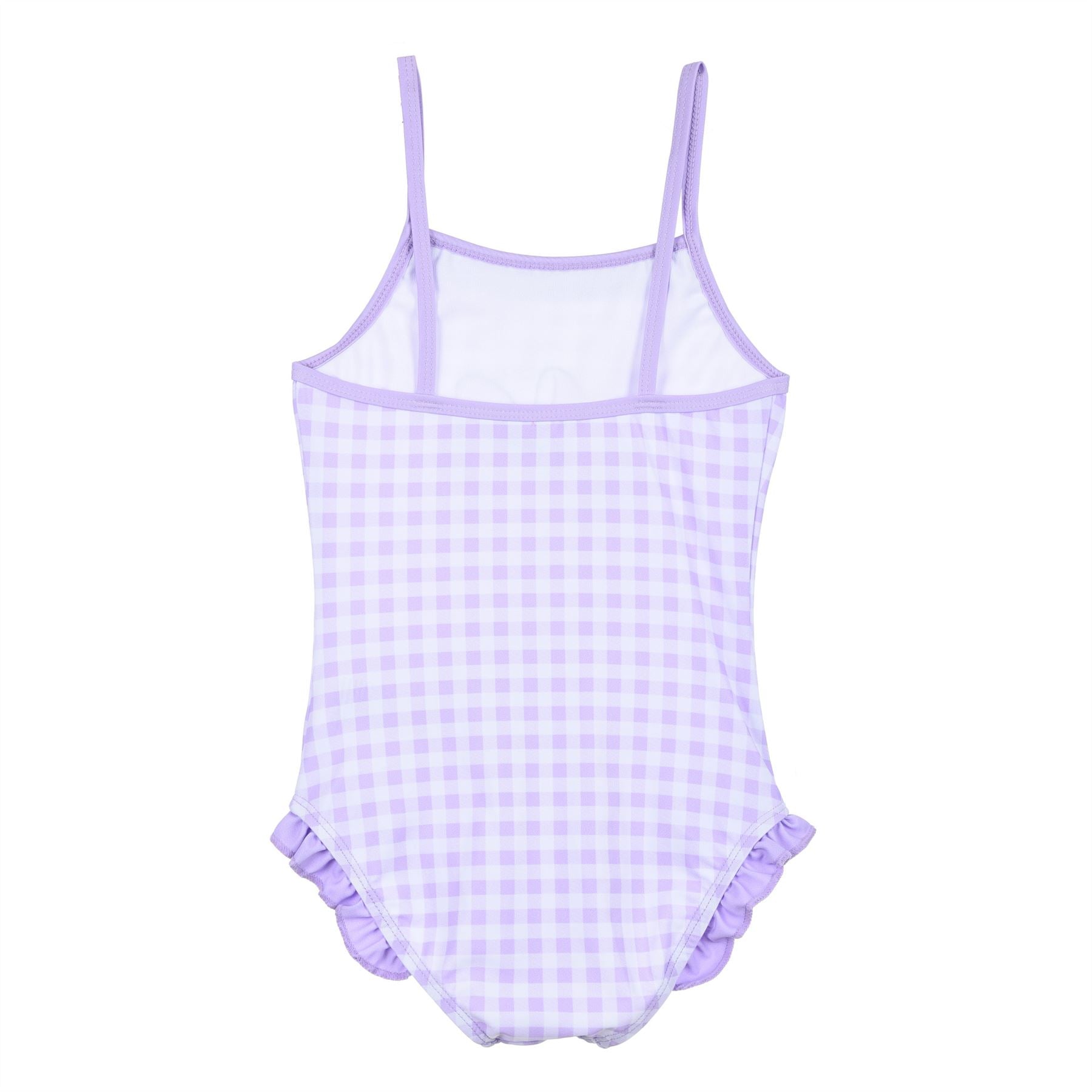 Girls' Disney Minnie Mouse swimsuit in purple, with a gingham print design.