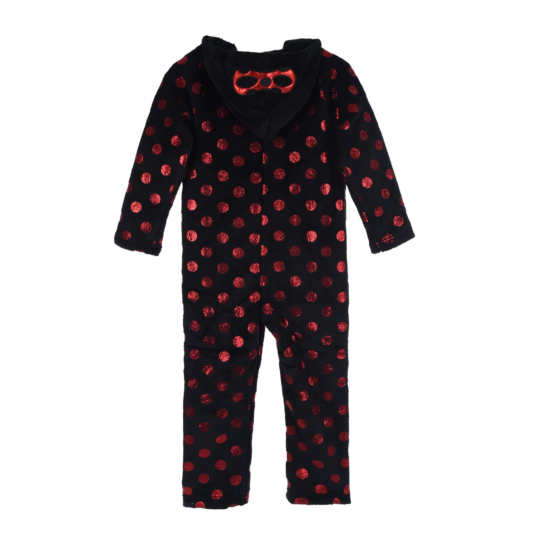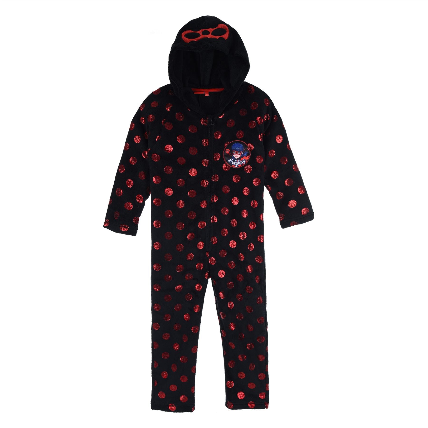 Kids' Miraculous Ladybug coral fleece all in one, in black. The onesie has a novelty hood, spot detail and a zip up front. Please note - hooded garments should never be worn while sleeping. 3 Years (to fit height 98cm), 4 Years (to fit height 104cm), 5 Years (to fit height 110cm), 6 Years (to fit height 116cm), 8 Years (to fit height 128cm)