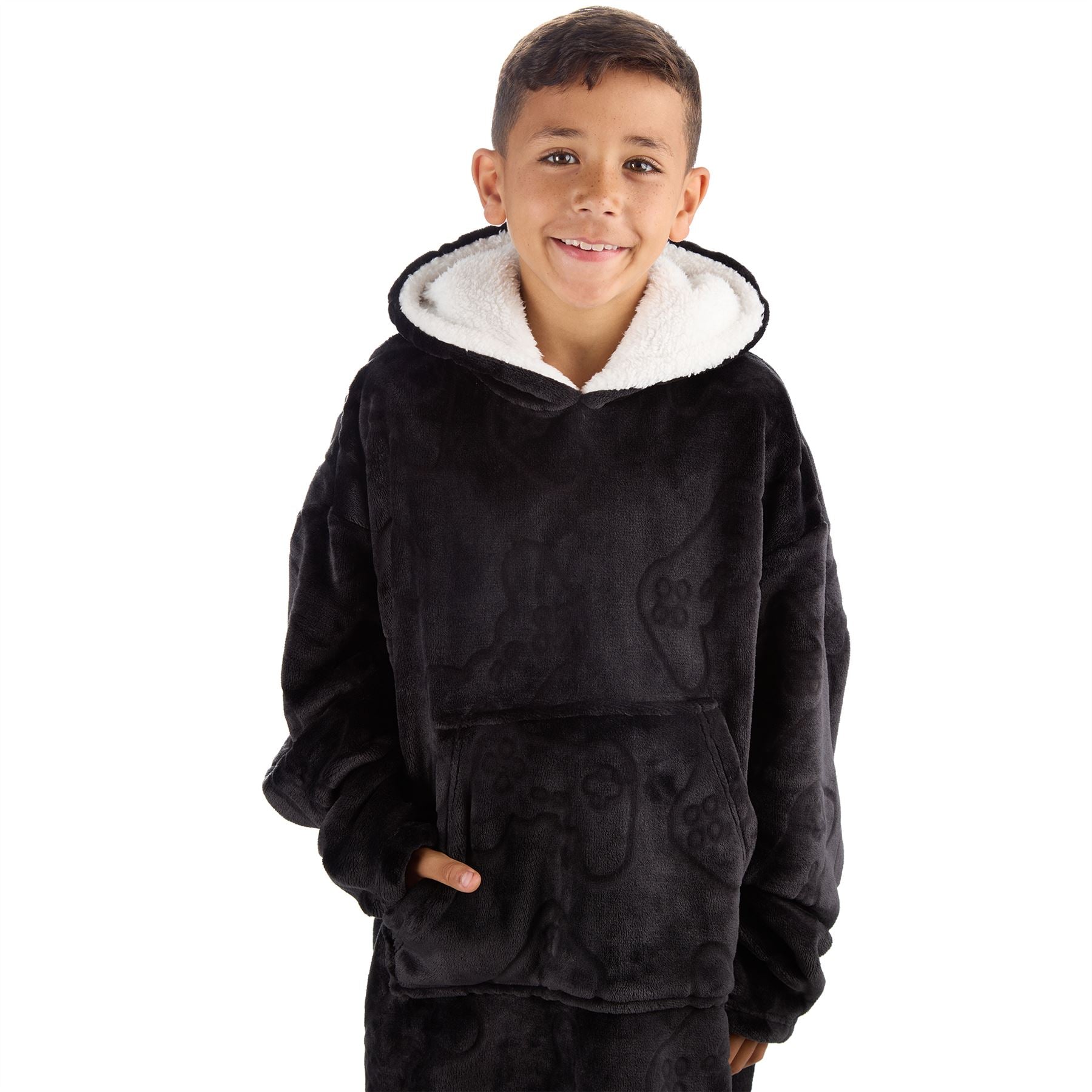 Kids' oversized fleece hoodie with embossed gamer detail. It has a sherpa lined hood and a kangaroo pocket at the front.