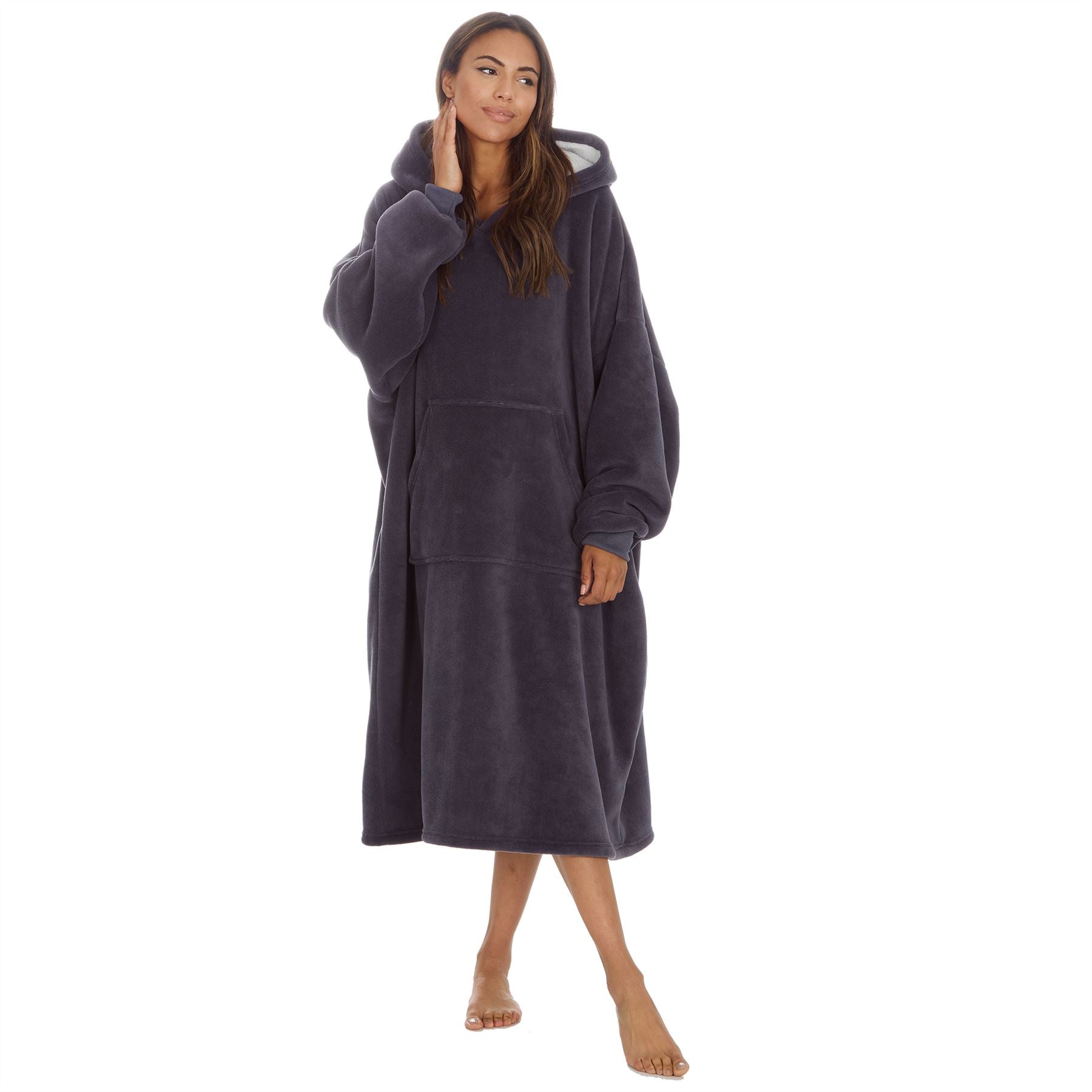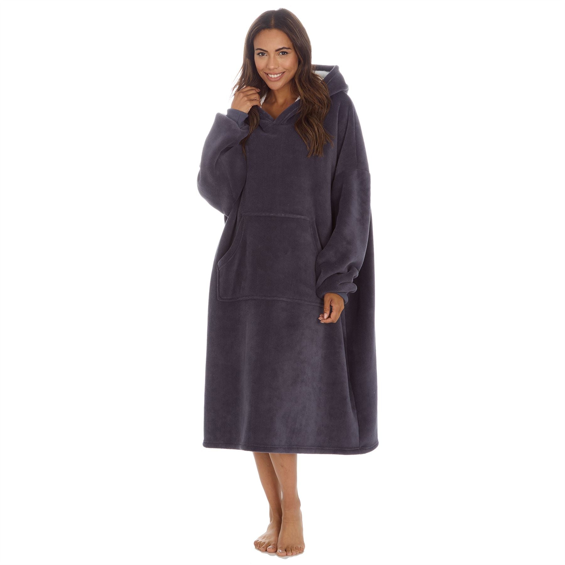 Women's bonded fleece oversized hoodie in grey. It has a full sherpa lining, hood, ribbed cuffs and a kangaroo pocket at the front. Length: Approximately 46 inches. Width: Approximately 34 inches.